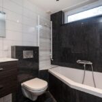 De badkamer heeft een mix van lichte en donkere tegels, wat zorgt voor een moderne uitstraling. Voorzien van ligbad met douche, wastafelmeubel, zwevend toilet en designradiator.