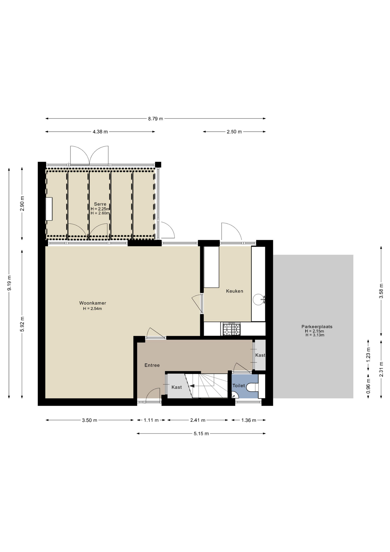 Bij binnenkomst kom je in de hal met toegang tot het toilet en de trap naar boven. De woonkamer is ruim en licht, met voldoende ruimte voor een grote zithoek en eetgedeelte. Aansluitend bevinden zich de ruime serre en de ruime keuken. Vanuit de woonkamer heb je bovendien toegang tot de royale achtertuin op het oosten.