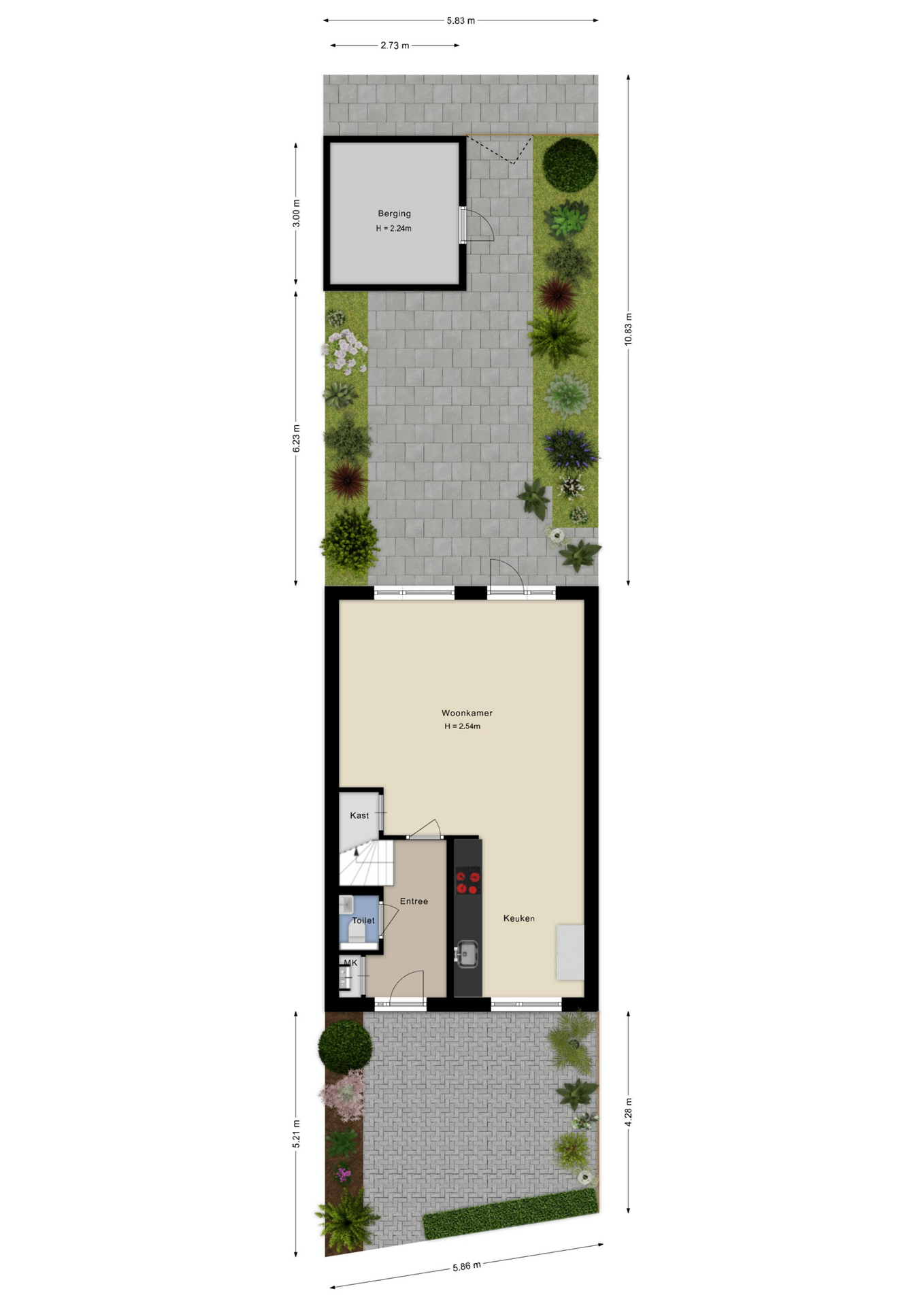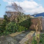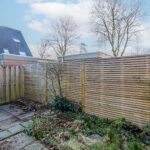Aansluitend bevindt zich de royale achtertuin op het oosten, met stenen berging en achterom.