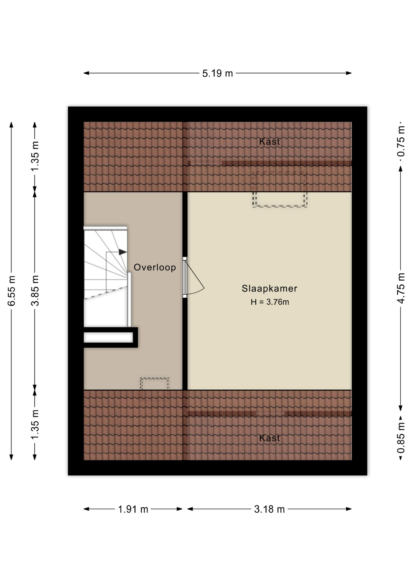 Via de overloop met wasmachine-aansluiting is de derde slaapkamer te bereiken. Deze verdieping beschikt tevens over diverse knieschotten.
