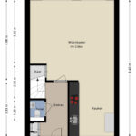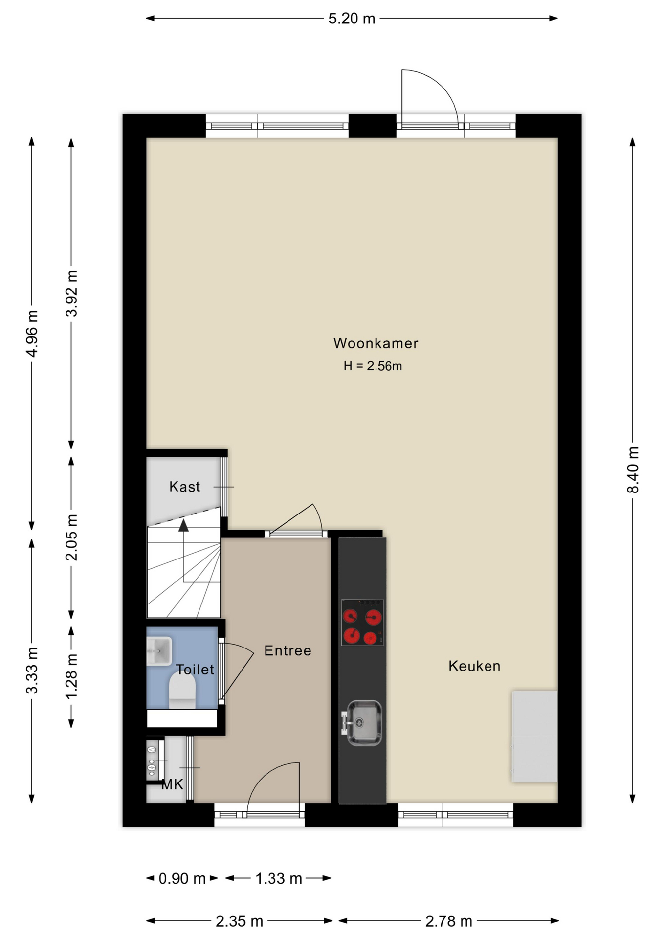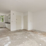 De hal/entree biedt toegang tot de ruime woonkamer, het toilet, de meterkast en trapopgang naar de eerste verdieping. De woonkamer is ca. 25 m² groot en voorzien van een trapkast en een nette open inbouwkeuken met diverse apparatuur.