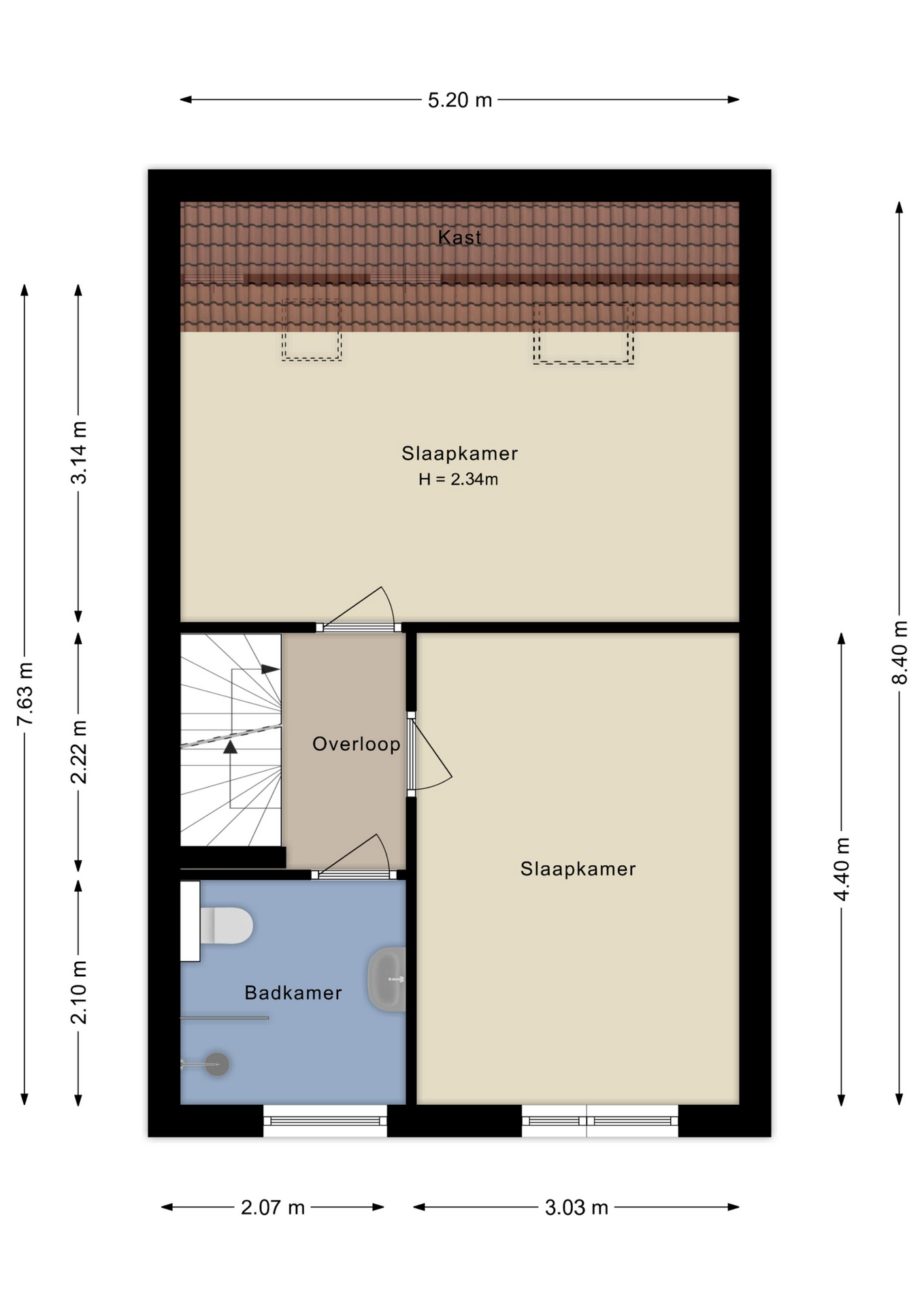 De overloop biedt toegang tot een tweetal goed bemeten slaapkamers, alsmede de nette badkamer met douche, toilet en wastafel.