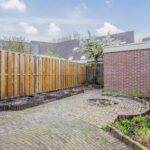 Aansluitend bevindt zich de royale achtertuin op het oosten, met stenen berging en achterom.
