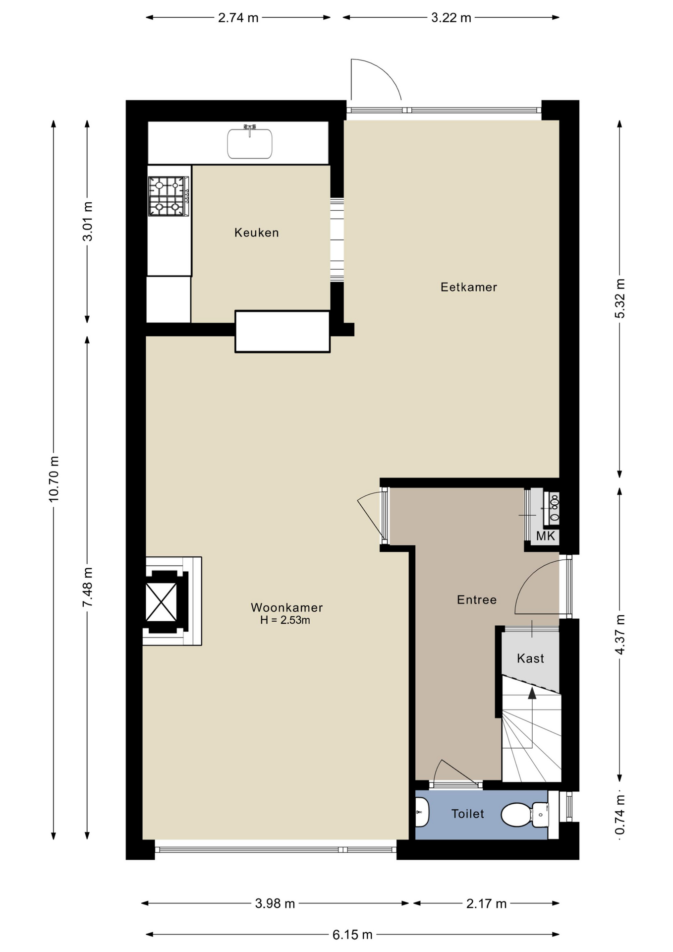 Via de ruime oprit, met plek voor meerdere auto's, kom je binnen in de hal. Hier vind je de meterkast, een toiletruimte en de trap naar de eerste verdieping. De lichte woonkamer is dankzij de grote raampartijen een heerlijke plek om te ontspannen. Aansluitend ligt de eetkamer, die in verbinding staat met de keuken. Vanuit de keuken en eetkamer is een toegangsdeur richting de diepe achtertuin.