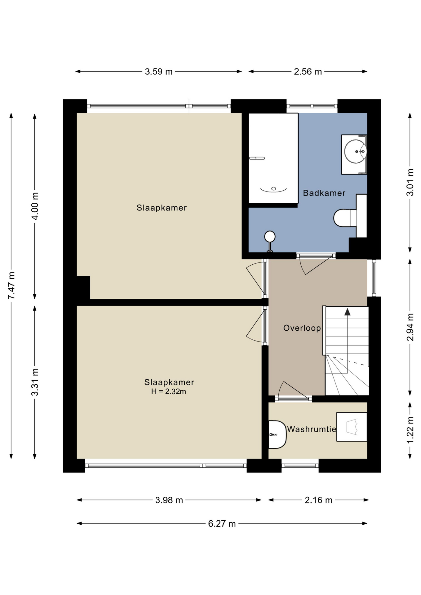 Overloop met toegang tot de badkamer, waskamer en twee (slaap)kamers. De twee (slaap)kamers zijn ruim qua formaat en zijn gesitueerd aan de voor- en achterzijde van de woning. De badkamer is basic maar heeft een douche, ligbad tweede toilet en wastafel.