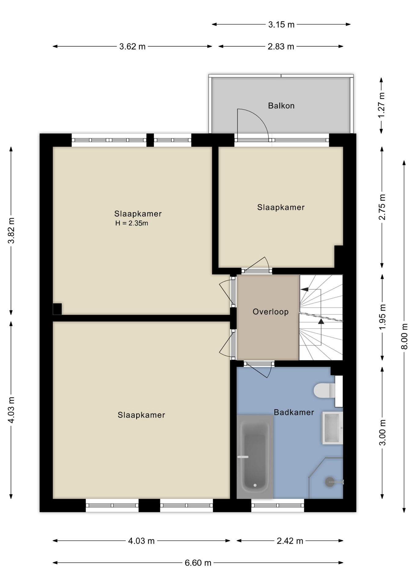 1e verdieping: overloop met twee slaapkamers aan de achterzijde, waarvan één met een deur naar het balkon. Aan de voorzijde bevindt zich de derde slaapkamer. De badkamer is netjes onderhouden en functioneel. De badkamer beschikt over een douche, toilet, ligbad en wastafel.