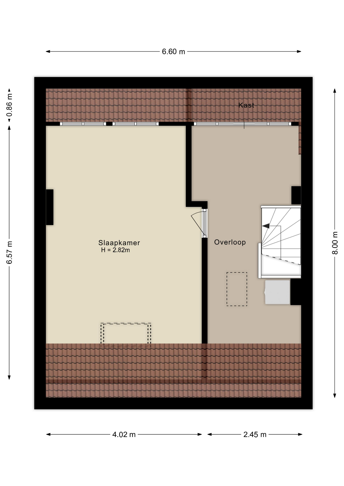 2e verdieping: via vaste trap bereikt u de voorzolder met dakvenster, de opstelplaats voor de c.v.-ketel (2013). Daarnaast vindt u hier een royale vierde (zolder)kamer.