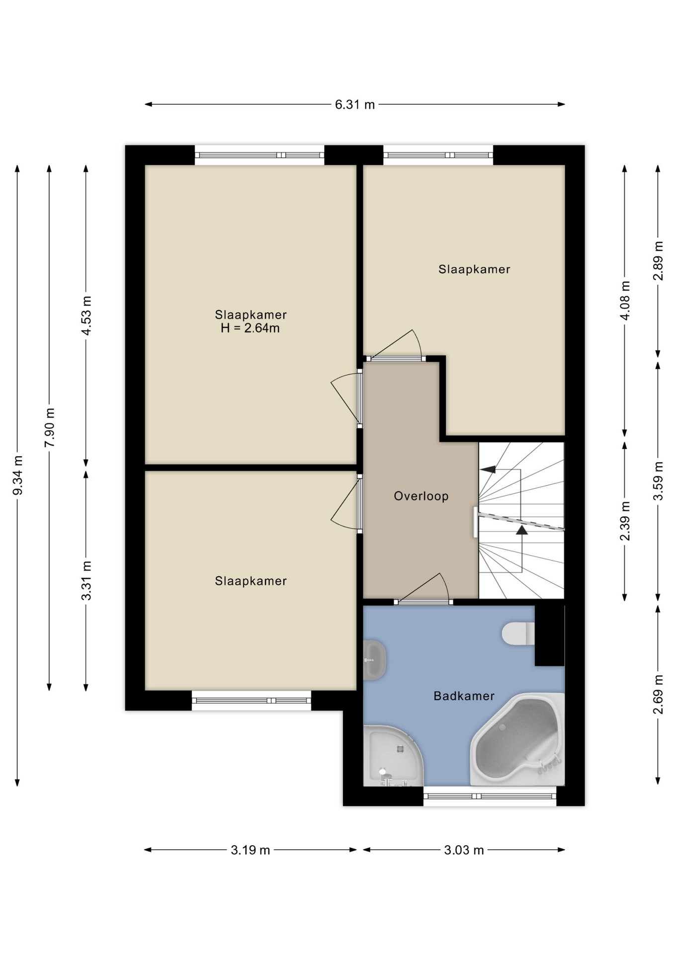 Op de eerste verdieping vind je drie royale slaapkamers, allen met een serene uitstraling en genoeg ruimte voor een persoonlijke touch. De badkamer is uitgerust met hoekbad voorzien van een whirlpool functie voor dat spa-gevoel thuis en een separate douche..