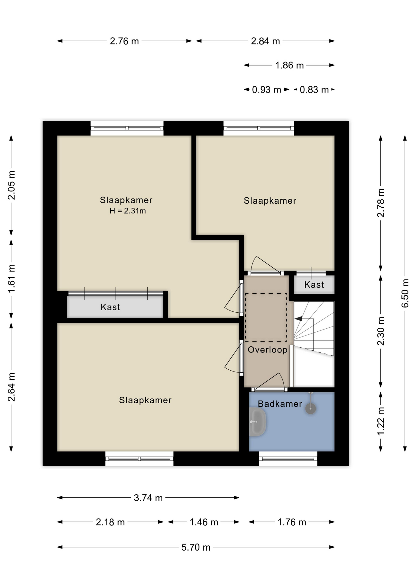 Op de overloop bevinden zich drie slaapkamers, waarvan twee met praktische vaste kasten. De badkamer is eenvoudig ingericht met een douche en een wastafel..