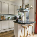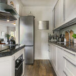 De ruime woonkamer is licht en sfeervol, met een karakteristieke erker aan de voorzijde en prettig uitzicht over de kade. Aan de achterzijde bevindt zich de moderne open keuken, voorzien van inbouwapparatuur en boiler, een kookeiland en veel werk- en opbergruimte. Vanuit de keuken stap je via een moderne schuifpui direct de tuin in.