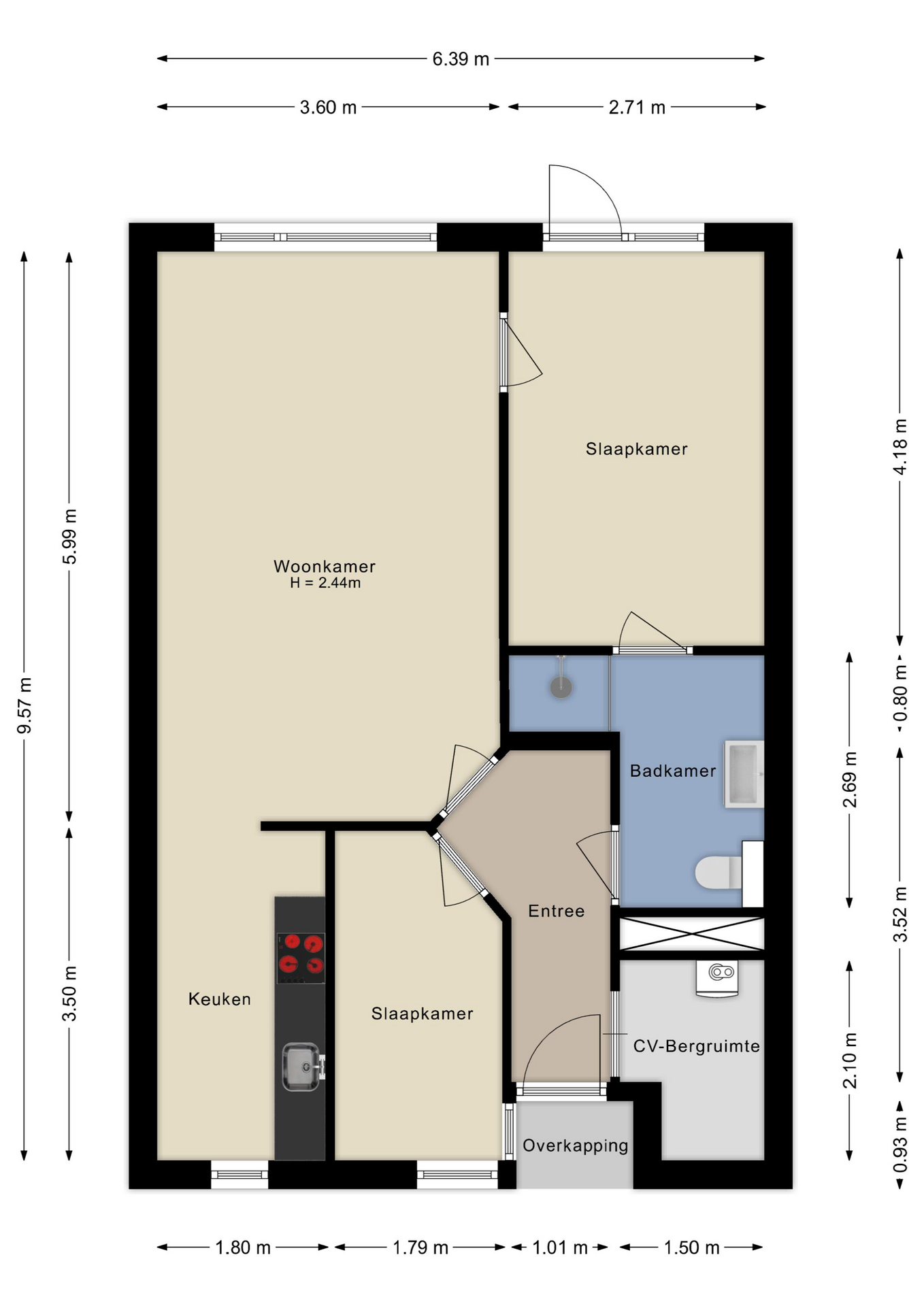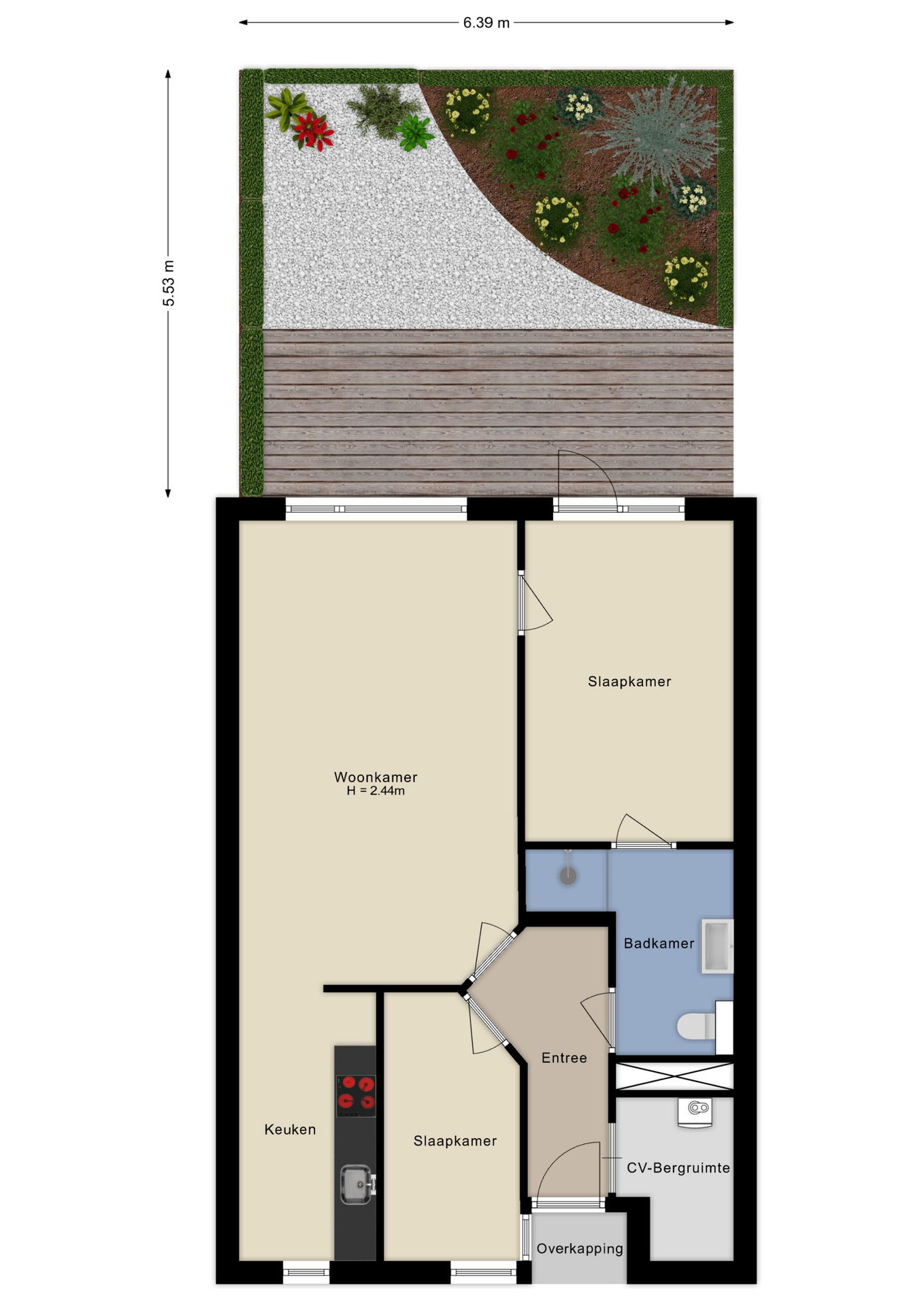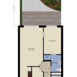 De woning ligt op de begane grond. Bij binnenkomst in de woning kom je in de hal. Vanuit de hal zijn de interne berging, de badkamer, de 1e slaapkamer en de woonkamer bereikbaar. De interne berging is ruim van formaat en hier vind je ook de CV ketel en mechanische ventilatie box. De badkamer is voorzien van een toilet, wastafel en inloopdouche. Tevens vind je hier de aansluiting voor de wasmachine en toegang tot de tweede slaapkamer. De eerste slaapkamer is circa 6 m2. Aangekomen in de woonkamer heb je toegang tot de half open keuken. Deze keuken is basic afgewerkt. De ruime woonkamer geeft tevens toegang tot de tweede slaapkamer. Vanuit deze slaapkamer van circa 11 m2 heb je toegang tot de badkamer en de tuin.