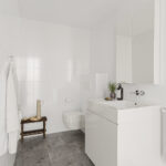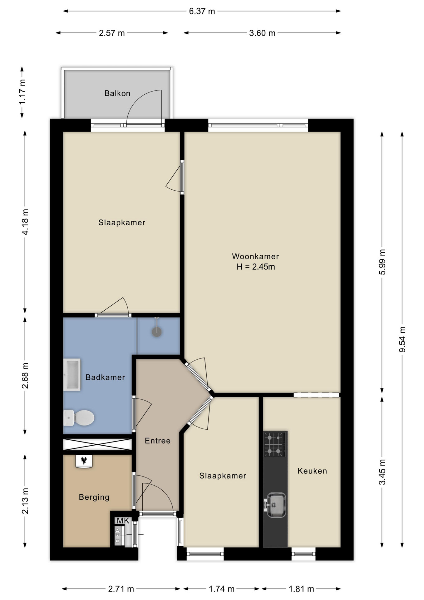 Bij binnenkomst in de woning kom je in de hal. Vanuit de hal zijn de interne berging, de badkamer, de 1e slaapkamer en de woonkamer bereikbaar. De interne berging is ruim van formaat en hier vind je ook de CV ketel en mechanische ventilatie box. De badkamer is voorzien van een hangtoilet, wastafelmeubel en inloopdouche. Tevens vind je hier de aansluiting voor de wasmachine en toegang tot de tweede slaapkamer. De eerste slaapkamer is circa 6 m2. Aangekomen in de woonkamer heb je toegang tot de half open keuken. Deze keuken is basic afgewerkt. De ruime woonkamer geeft tevens toegang tot de tweede slaapkamer. Vanuit deze slaapkamer van circa 11 m2 heb je toegang tot de badkamer en het balkon.