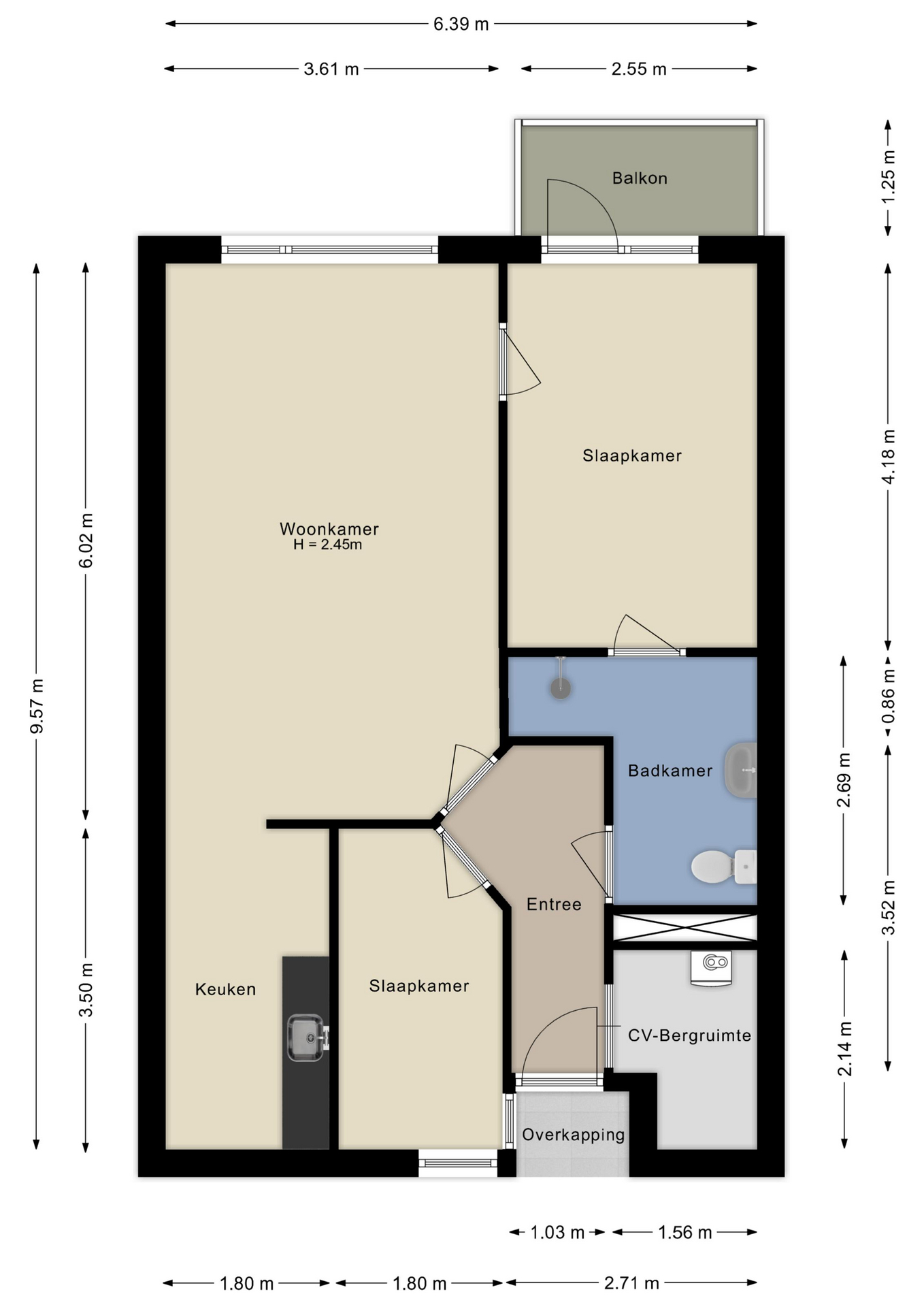 Bij binnenkomst in de woning kom je in de hal. Vanuit de hal zijn de interne berging, de badkamer, de 1e slaapkamer en de woonkamer bereikbaar. De interne berging is ruim van formaat en hier vind je ook de CV ketel en mechanische ventilatie box. De badkamer is voorzien van een toilet, wastafel en inloopdouche. Tevens vind je hier de aansluiting voor de wasmachine en toegang tot de tweede slaapkamer. De eerste slaapkamer is circa 6 m2. Aangekomen in de woonkamer heb je toegang tot de half open keuken. Deze keuken is basic afgewerkt. De ruime woonkamer geeft tevens toegang tot de tweede slaapkamer. Vanuit deze slaapkamer van circa 11 m2 heb je toegang tot de badkamer en het balkon.
