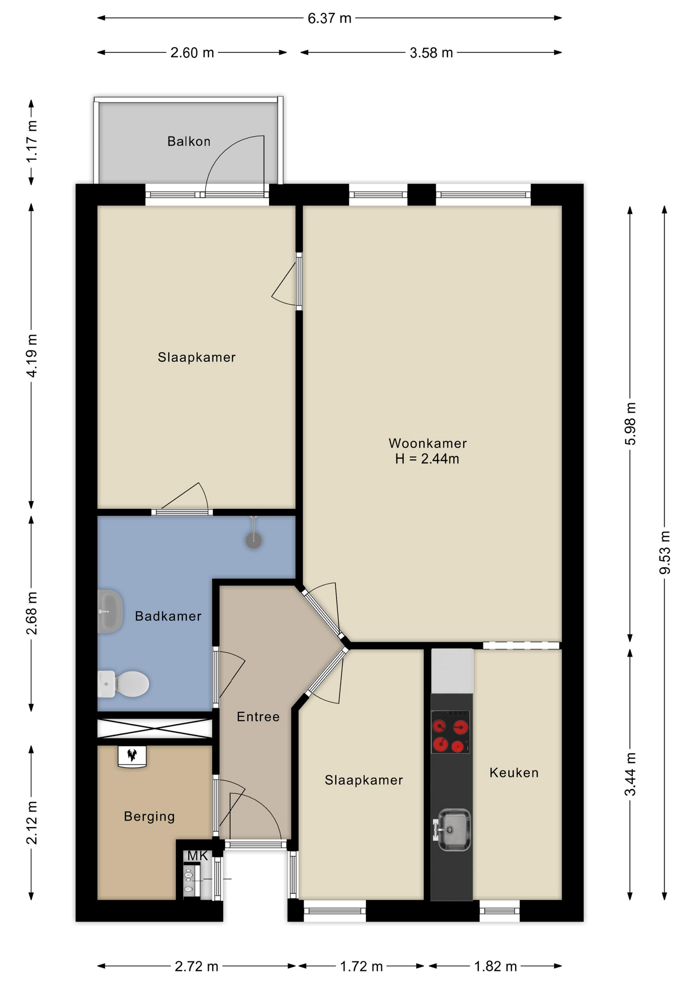 Bij binnenkomst in de woning kom je in de hal. Vanuit de hal zijn de interne berging, de badkamer, de 1e slaapkamer en de woonkamer bereikbaar. De interne berging is ruim van formaat en hier vind je ook de CV ketel en mechanische ventilatie box. De badkamer is voorzien van een toilet, wastafel en inloopdouche. Tevens vind je hier de aansluiting voor de wasmachine en toegang tot de tweede slaapkamer. De eerste slaapkamer is circa 6 m2. Aangekomen in de woonkamer heb je toegang tot de half open keuken. Deze keuken is luxe afgewerkt en beschikt over diverse inbouwapparatuur, zoals koel-/vriescombinatie, combimagnetron, vaatwasser en inductie kookplaat. De ruime woonkamer geeft tevens toegang tot de tweede slaapkamer. Vanuit deze slaapkamer van circa 11 m2 heb je toegang tot de badkamer en het balkon.