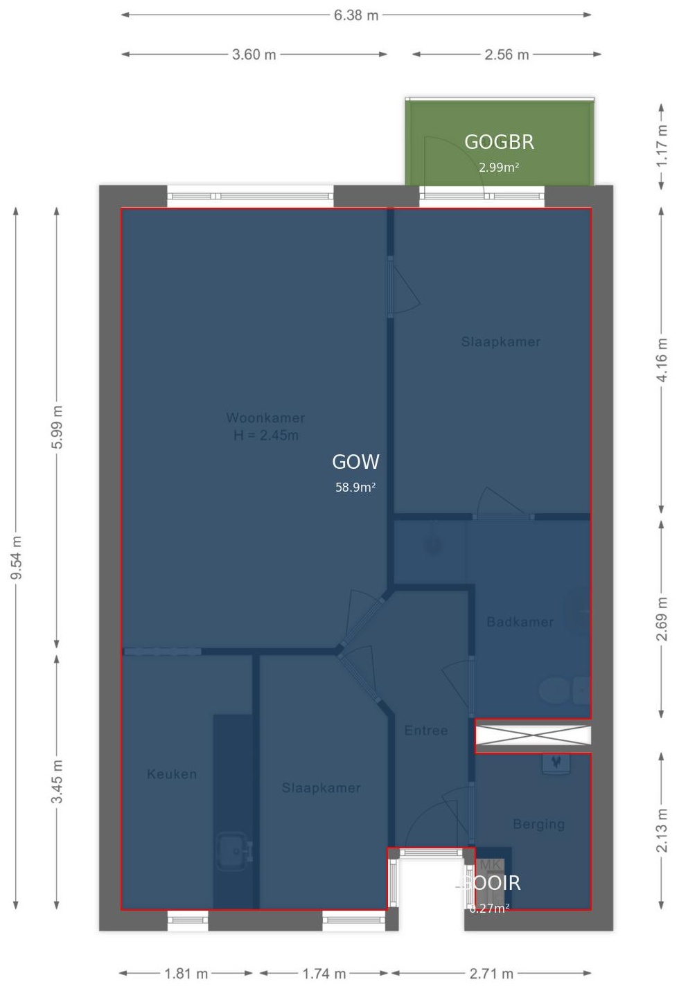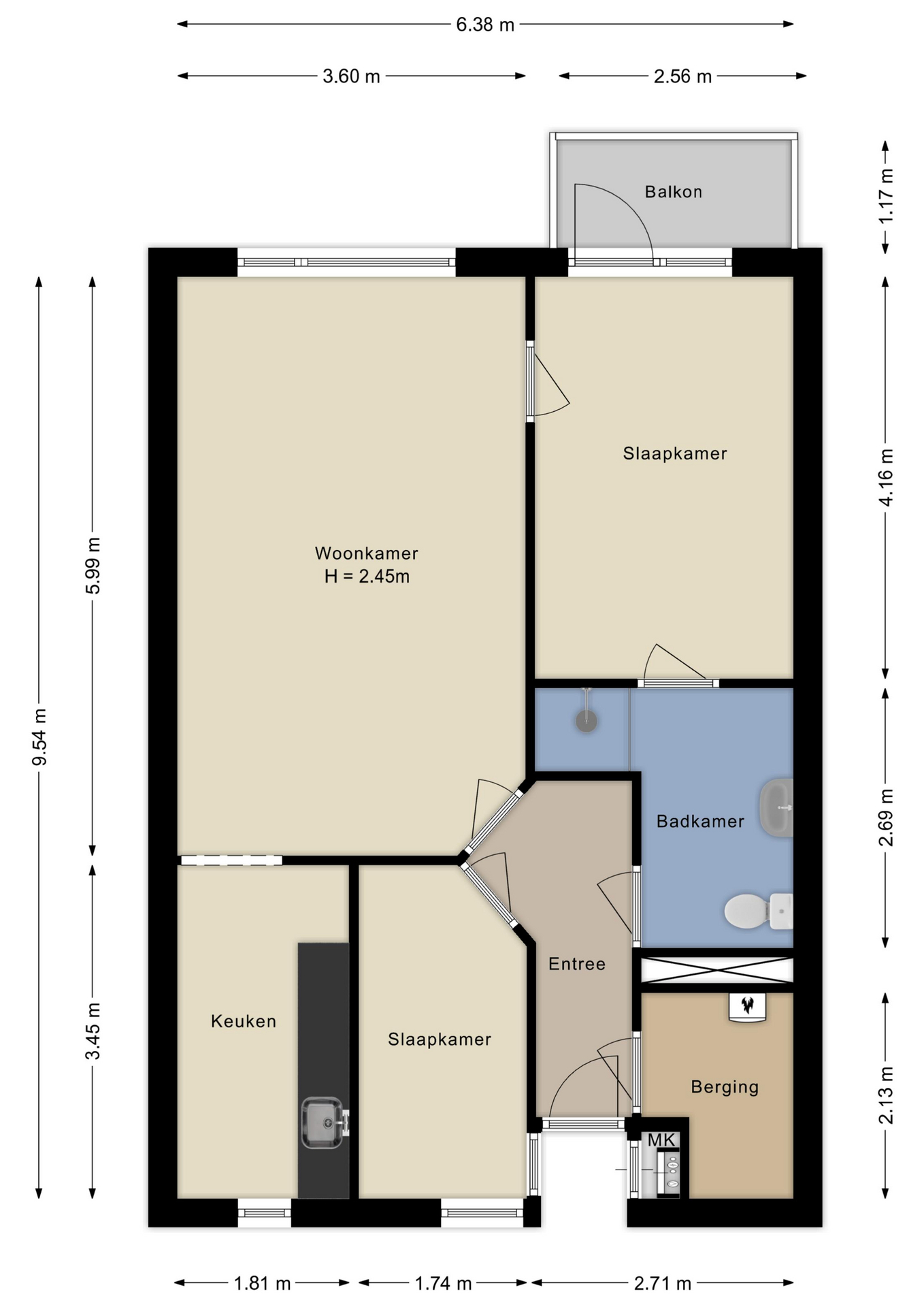 Bij binnenkomst in de woning kom je in de hal. Vanuit de hal zijn de interne berging, de badkamer, de 1e slaapkamer en de woonkamer bereikbaar. De interne berging is ruim van formaat en hier vind je ook de CV ketel en mechanische ventilatie box. De badkamer is voorzien van een toilet, wastafel en inloopdouche. Tevens vind je hier de aansluiting voor de wasmachine en toegang tot de tweede slaapkamer. De eerste slaapkamer is circa 6 m2. Aangekomen in de woonkamer heb je toegang tot de half open keuken. Deze keuken is basic afgewerkt. De ruime woonkamer geeft tevens toegang tot de tweede slaapkamer. Vanuit deze slaapkamer van circa 11 m2 heb je toegang tot de badkamer en het balkon. Het balkon is gelegen op het oosten.
