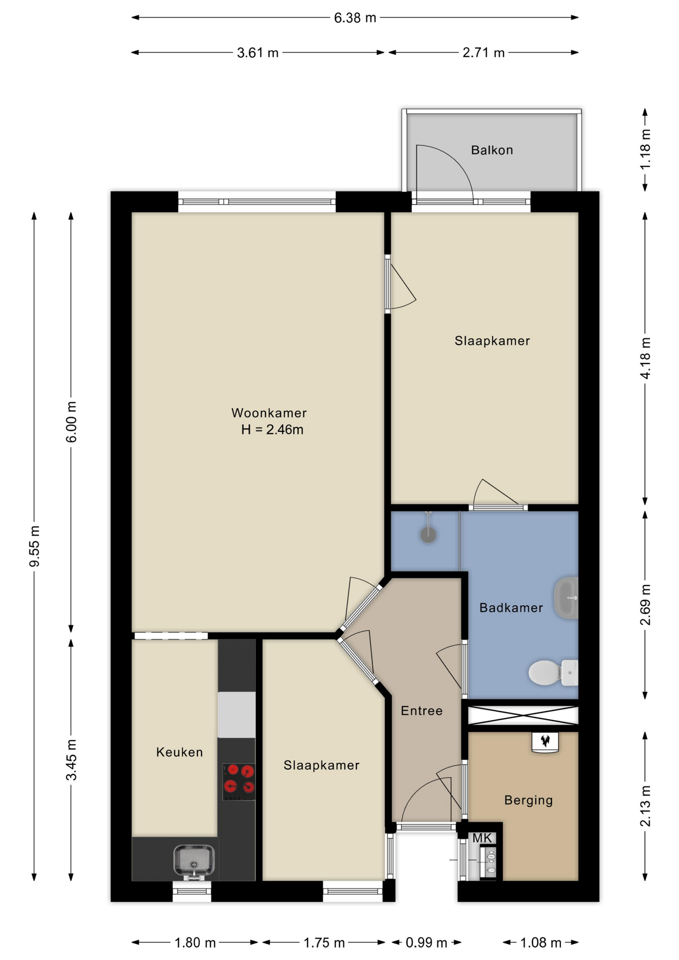 Bij binnenkomst in de woning kom je in de hal. Vanuit de hal zijn de interne berging, de badkamer, de 1e slaapkamer en de woonkamer bereikbaar. De interne berging is ruim van formaat en hier vind je ook de CV ketel en mechanische ventilatie box. De badkamer is voorzien van een toilet, wastafel en inloopdouche. Tevens vind je hier de aansluiting voor de wasmachine en toegang tot de tweede slaapkamer. De eerste slaapkamer is circa 6 m2. Aangekomen in de woonkamer heb je toegang tot de half open keuken. Deze keuken is basic afgewerkt. De ruime woonkamer geeft tevens toegang tot de tweede slaapkamer. Vanuit deze slaapkamer van circa 11 m2 heb je toegang tot de badkamer en het balkon.