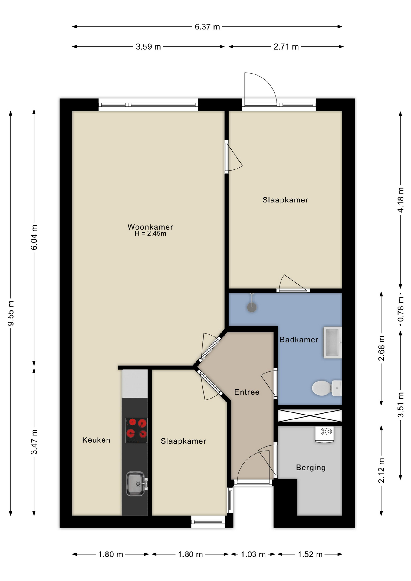 De woning ligt op de begane grond. Bij binnenkomst in de woning kom je in de hal. Vanuit de hal zijn de inpandige berging, de badkamer, de 1e slaapkamer en de woonkamer bereikbaar. De inpandige berging is ruim van formaat en hier vind je ook de CV ketel en mechanische ventilatie box. De badkamer is voorzien van een toilet, wastafel en inloopdouche. Tevens vind je hier de aansluiting voor de wasmachine en toegang tot de tweede slaapkamer. De eerste slaapkamer is circa 6 m2. Aangekomen in de woonkamer heb je toegang tot de half open keuken. Deze keuken is luxe afgewerkt met diverse inbouwapparatuur. De ruime woonkamer geeft tevens toegang tot de tweede slaapkamer. Vanuit deze slaapkamer van circa 11 m2 heb je toegang tot de badkamer en de tuin.