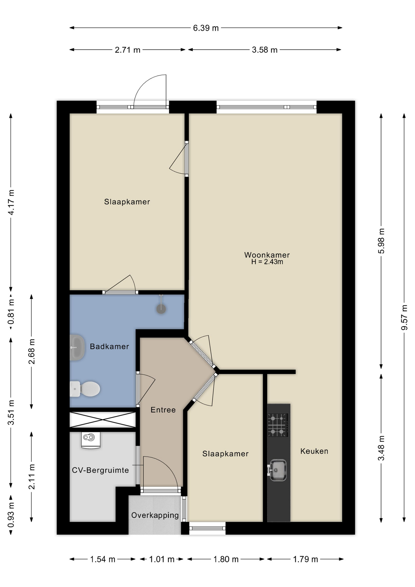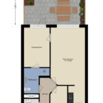 De woning ligt op de begane grond. Bij binnenkomst in de woning kom je in de hal. Vanuit de hal zijn de interne berging, de badkamer, de 1e slaapkamer en de woonkamer bereikbaar. De interne berging is ruim van formaat en hier vind je ook de CV ketel en mechanische ventilatie box. De badkamer is voorzien van een toilet, wastafel en inloopdouche. Tevens vind je hier de aansluiting voor de wasmachine en toegang tot de tweede slaapkamer. De eerste slaapkamer is circa 6 m2. Aangekomen in de woonkamer heb je toegang tot de half open keuken. Deze keuken is basic afgewerkt. De ruime woonkamer geeft tevens toegang tot de tweede slaapkamer. Vanuit deze slaapkamer van circa 11 m2 heb je toegang tot de badkamer en de tuin.