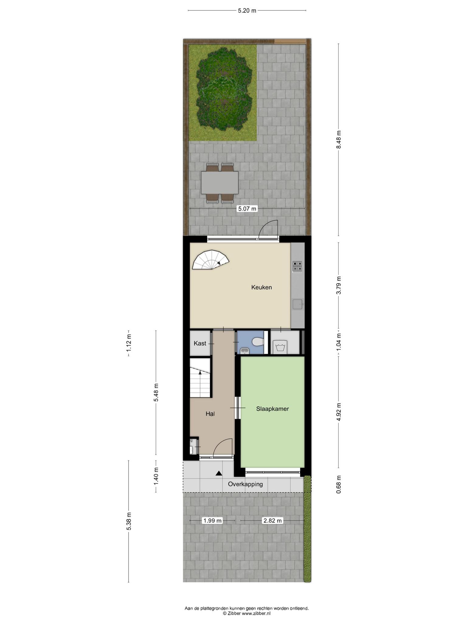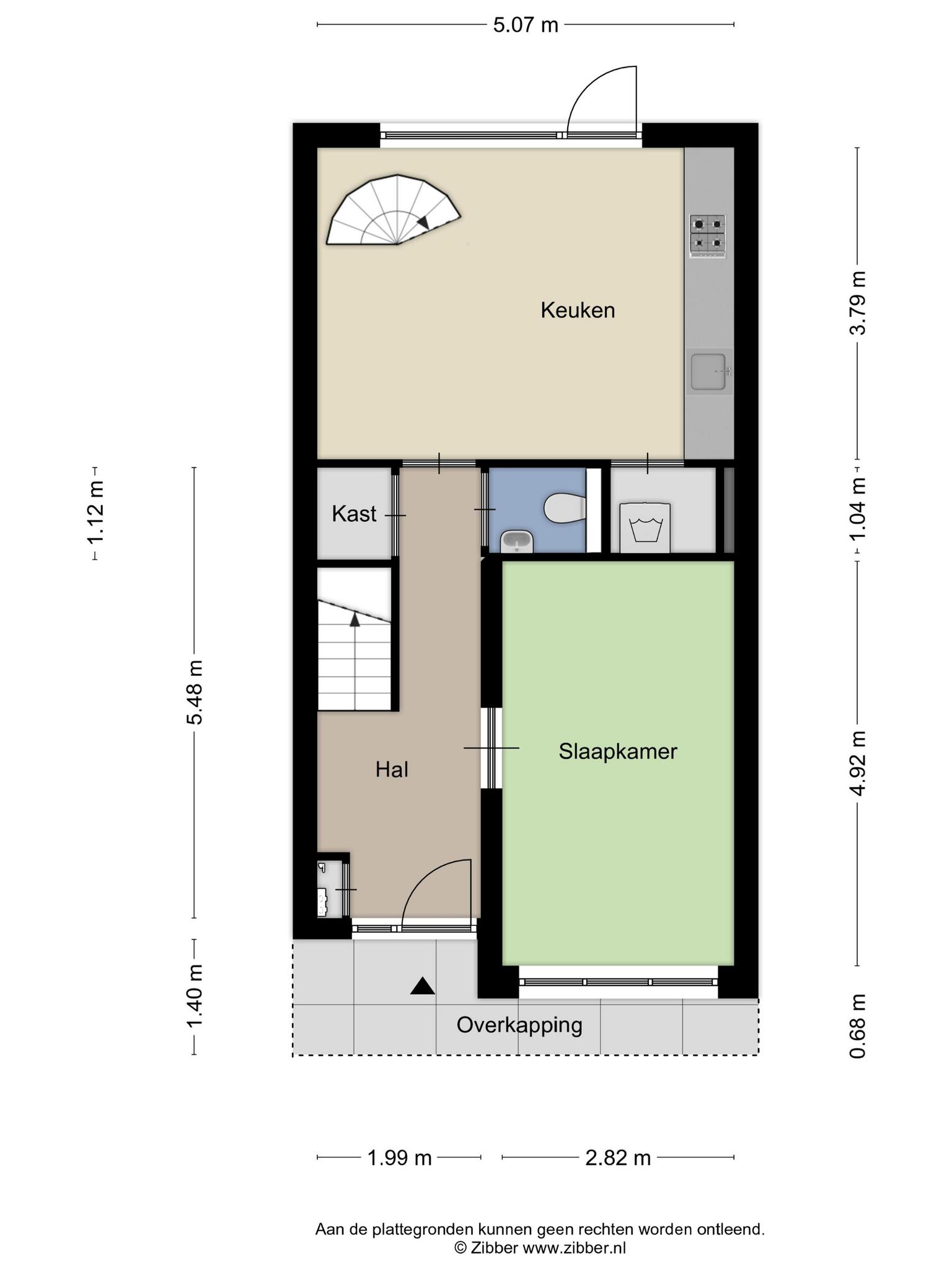 De voortuin met eigen oprit biedt toegang tot de woning. Vanuit de hal zijn de riante keuken, slaapkamer, meterkast, het toilet en de trapopgang naar de eerste verdieping te bereiken. De keuken is voorzien van veel bergruimte en diverse inbouwapparatuur. De keuken biedt daarnaast ruimte voor een grote eettafel. Via de keuken is de achtertuin te bereiken. Deze is verzorgd ingericht en is grotendeels bestraat.