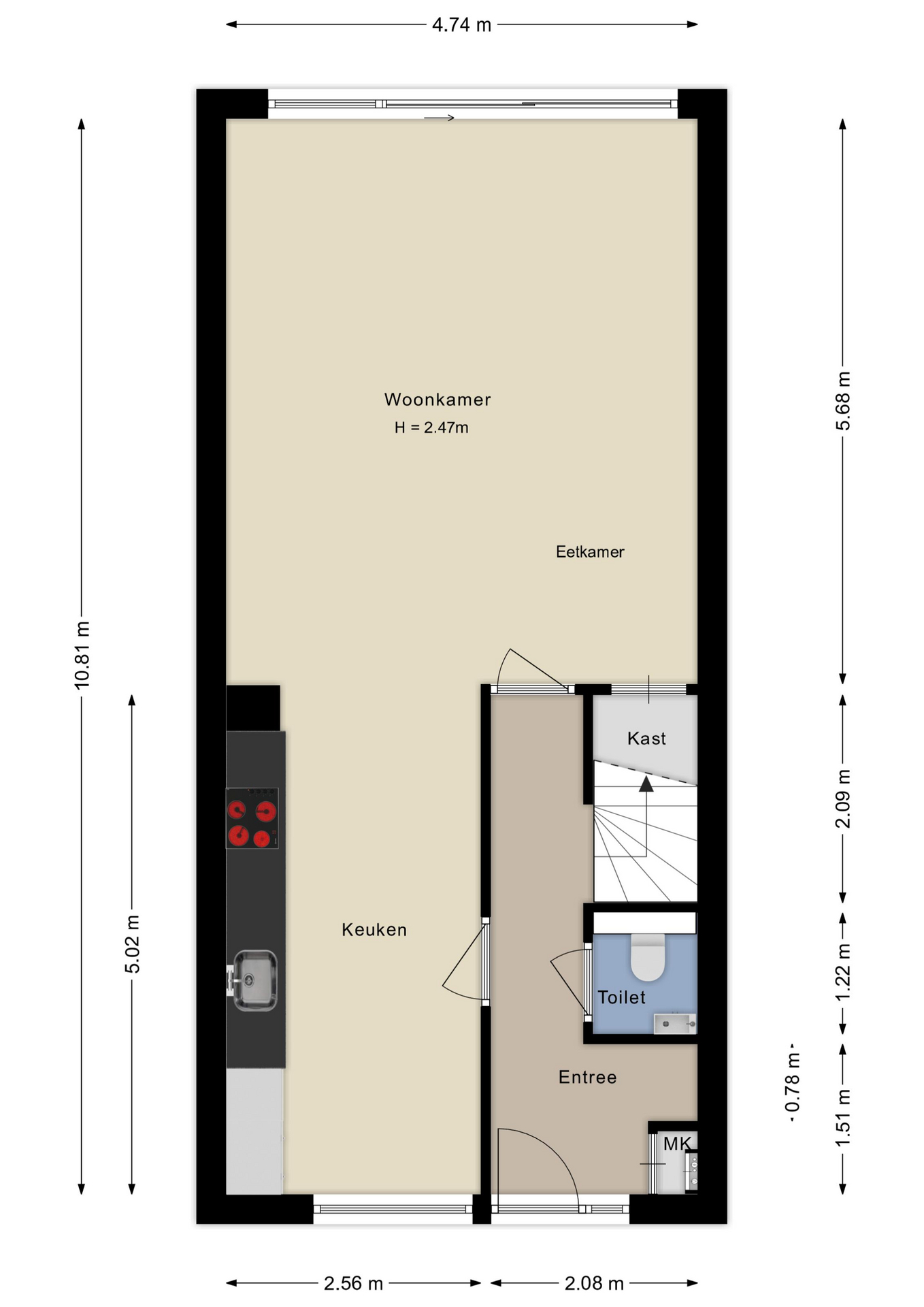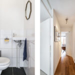 Via de entree kom je in de ruime hal met toegang tot de meterkast, het toilet en de trap naar boven. Het toilet is voorzien van een hangend closet en een fonteintje.