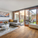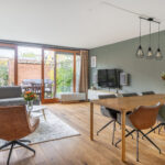 De lichte woonkamer heeft een grote schuifpui, waardoor er veel daglicht binnenvalt en je direct toegang hebt tot de achtertuin. De begane grond is voorzien van een houten vloer in de woonkamer en een tegelvloer in de keuken.