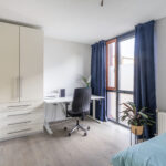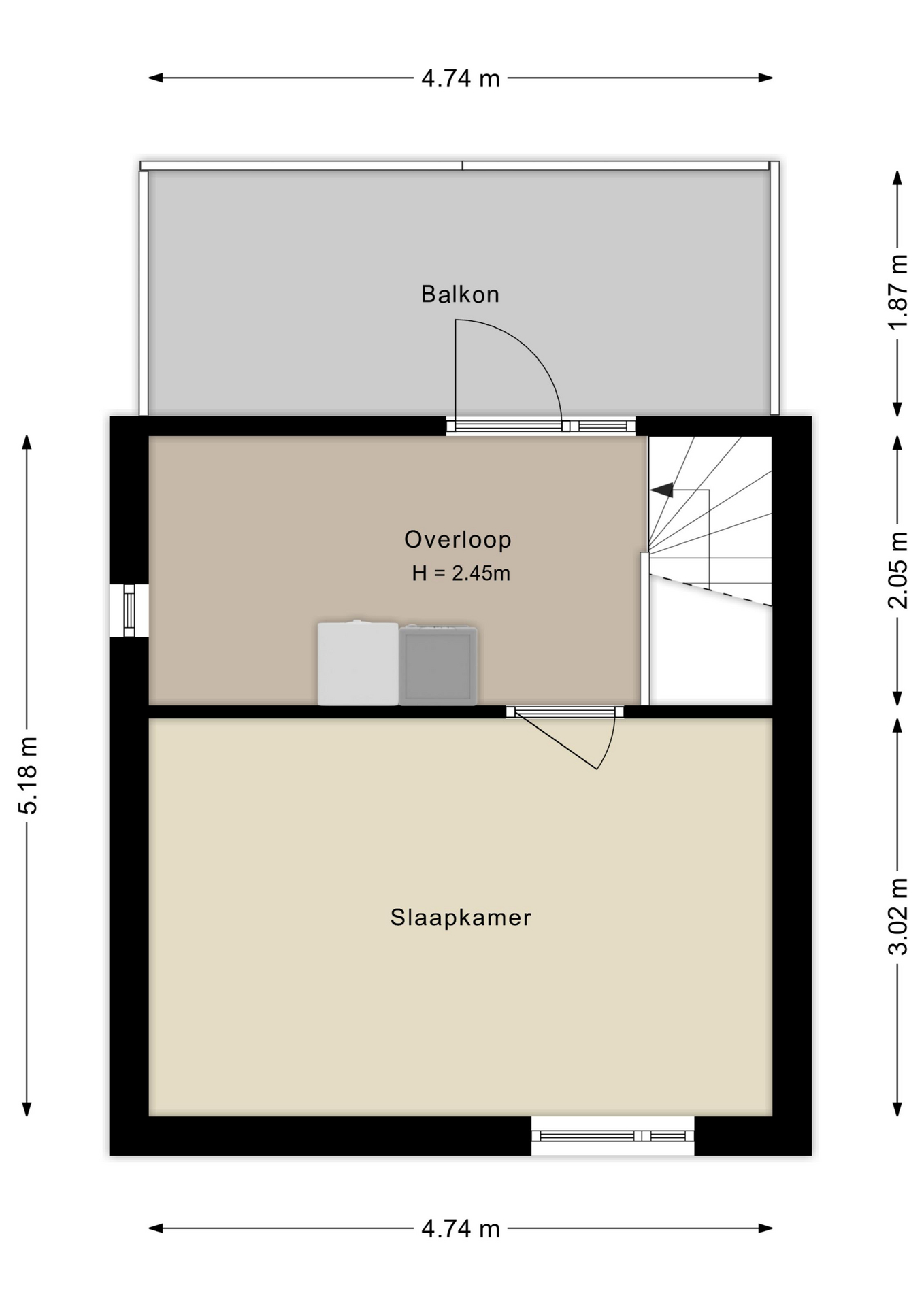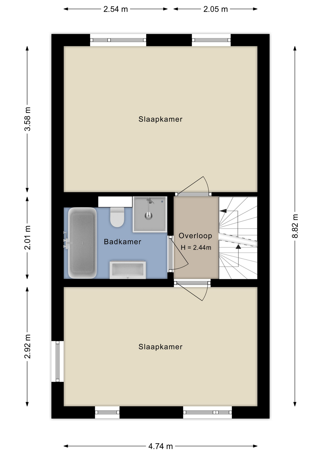 De slaapkamer aan de achterzijde is circa 17m², die aan de voorzijde ongeveer 14m². Dankzij de grote ramen zijn beide kamers heerlijk licht.