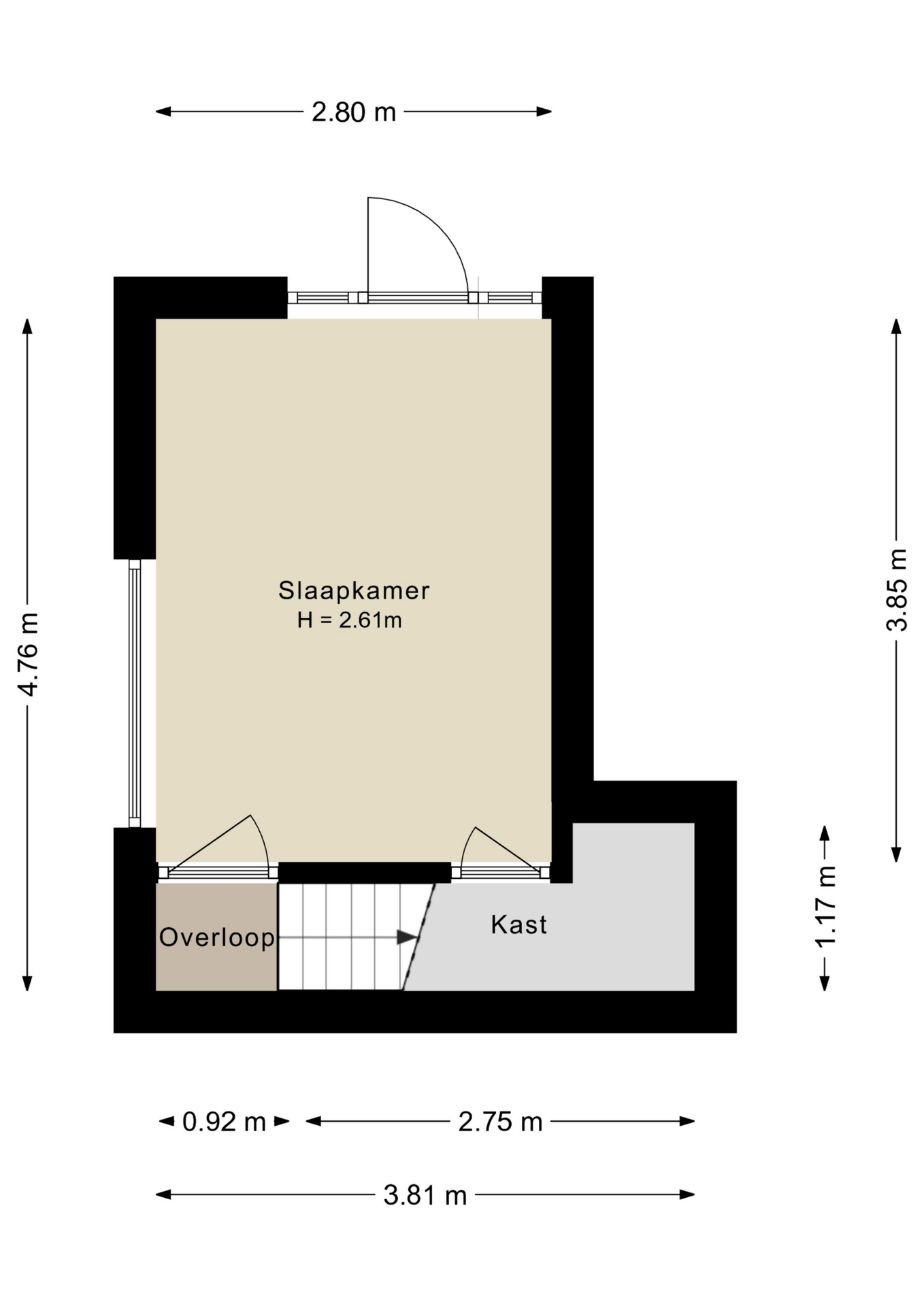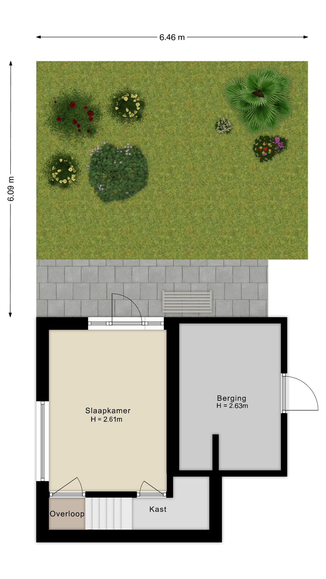 Via de tuin is er toegang tot de slaapkamer/hobbyruimte. Daarnaast is er een zeer ruime trappenkast en een trap die naar de bovenverdieping leidt.