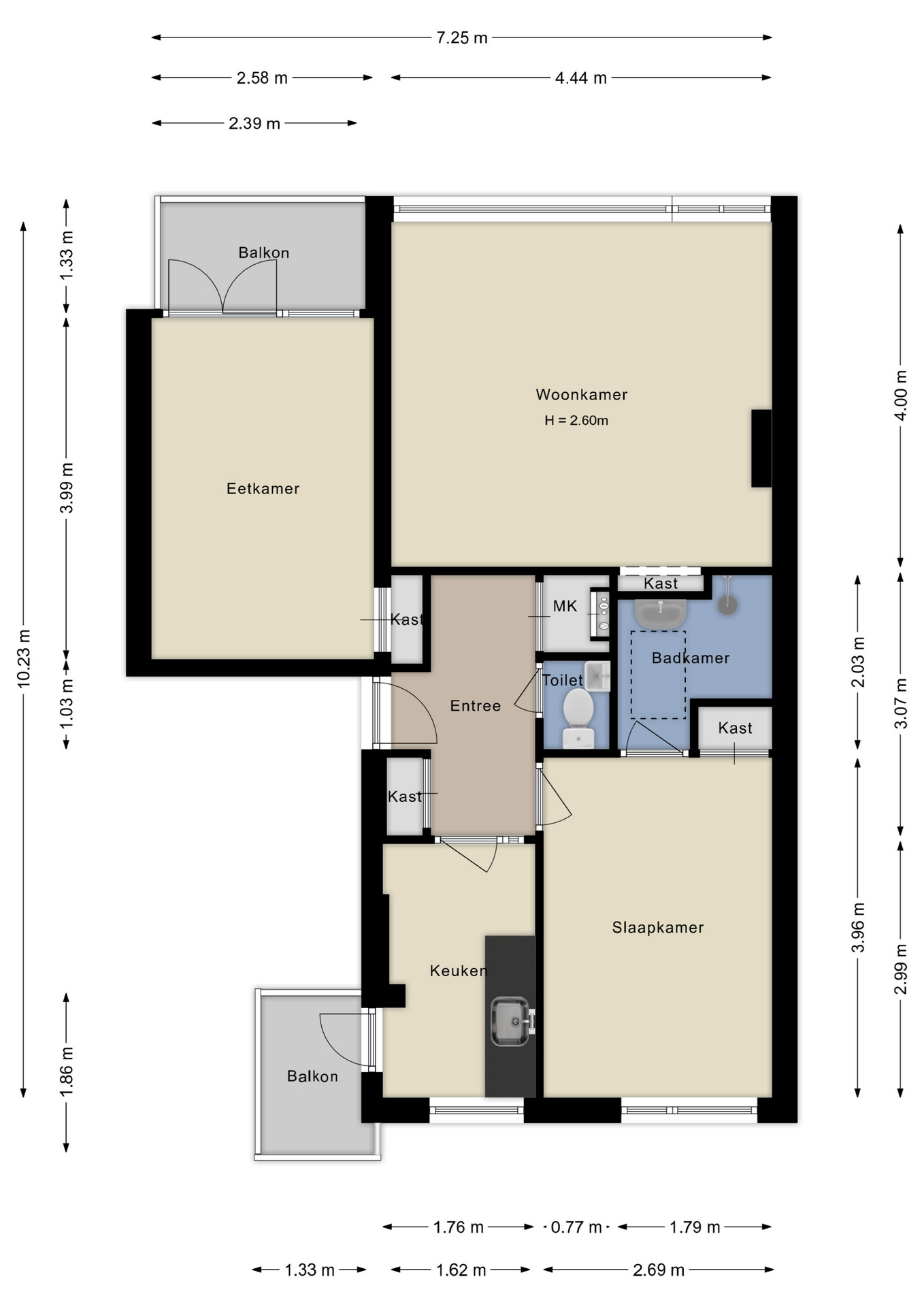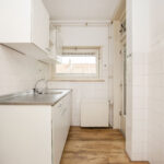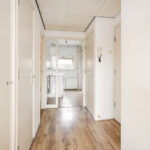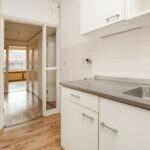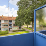 Via de ruime hal bereik je alle vertrekken. De woonkamer is heerlijk licht door de grote raampartijen en beschikt over een schouw met ombouw en een vaste kast. Aangrenzend vind je een zij-/slaapkamer met vaste kast en dubbele deuren naar het balkon op het zuidoosten. in de hal bevinden zich het separate toilet met fontein, een diepe meterkast met extra bergruimte en nog een vaste kast. De gesloten keuken is voorzien van een eenvoudig keukenblok en aansluitingen voor witgoed. Vanuit de keuken stap je het tweede balkon op, gelegen aan de noordwestzijde. De ruime slaapkamer beschikt eveneens over een vaste kast en biedt directe toegang tot de badkamer met douche en wastafel.