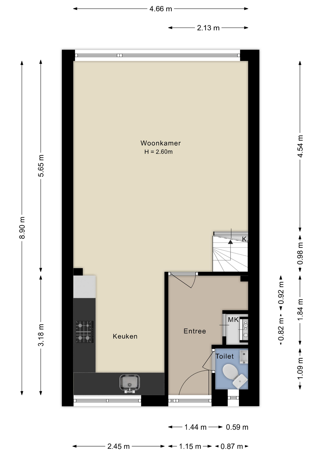 Vanaf de entree met hal en modern toilet bereik je de lichte woonkamer, voorzien van laminaat en kunststof kozijnen. De open keuken is uitgerust met diverse inbouwapparatuur. Een fijne, praktische leefruimte waar koken en gezellig samenzijn centraal staan.
