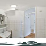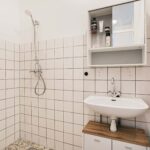 De badkamer is praktisch ingericht met een inloopdouche en een wastafelmeubel. Een verzorgde ruimte waar je comfortabel de dag begint of juist ontspannen afsluit.