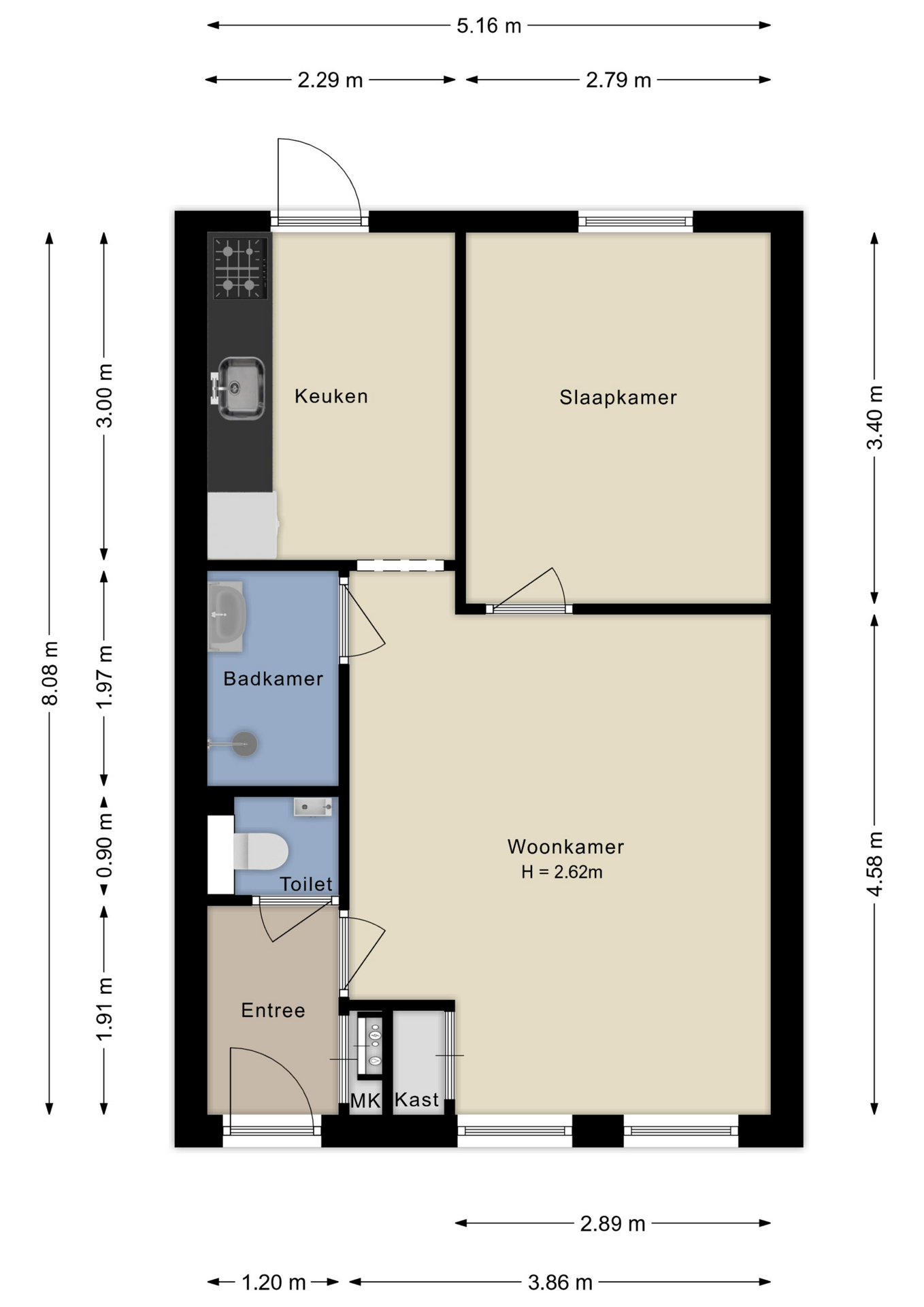 Je komt binnen in de hal met meterkast en een separaat toilet, vernieuwd in 2023. Vanuit hier stap je de ruime woonkamer binnen. De grote raampartijen zorgen voor veel daglicht en geven de ruimte een open en aangenaam karakter. De vaste kast biedt praktische opbergruimte en de indeling maakt het eenvoudig om een comfortabele zit- en eethoek te creëren.