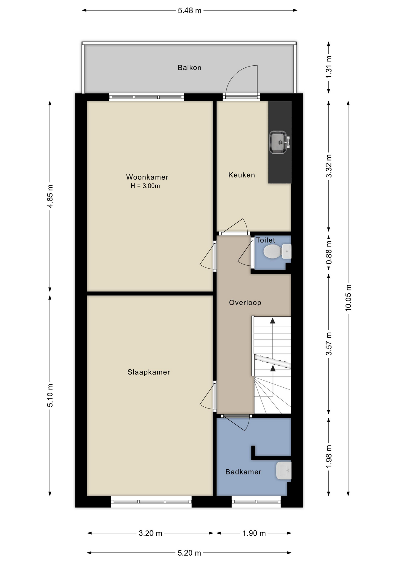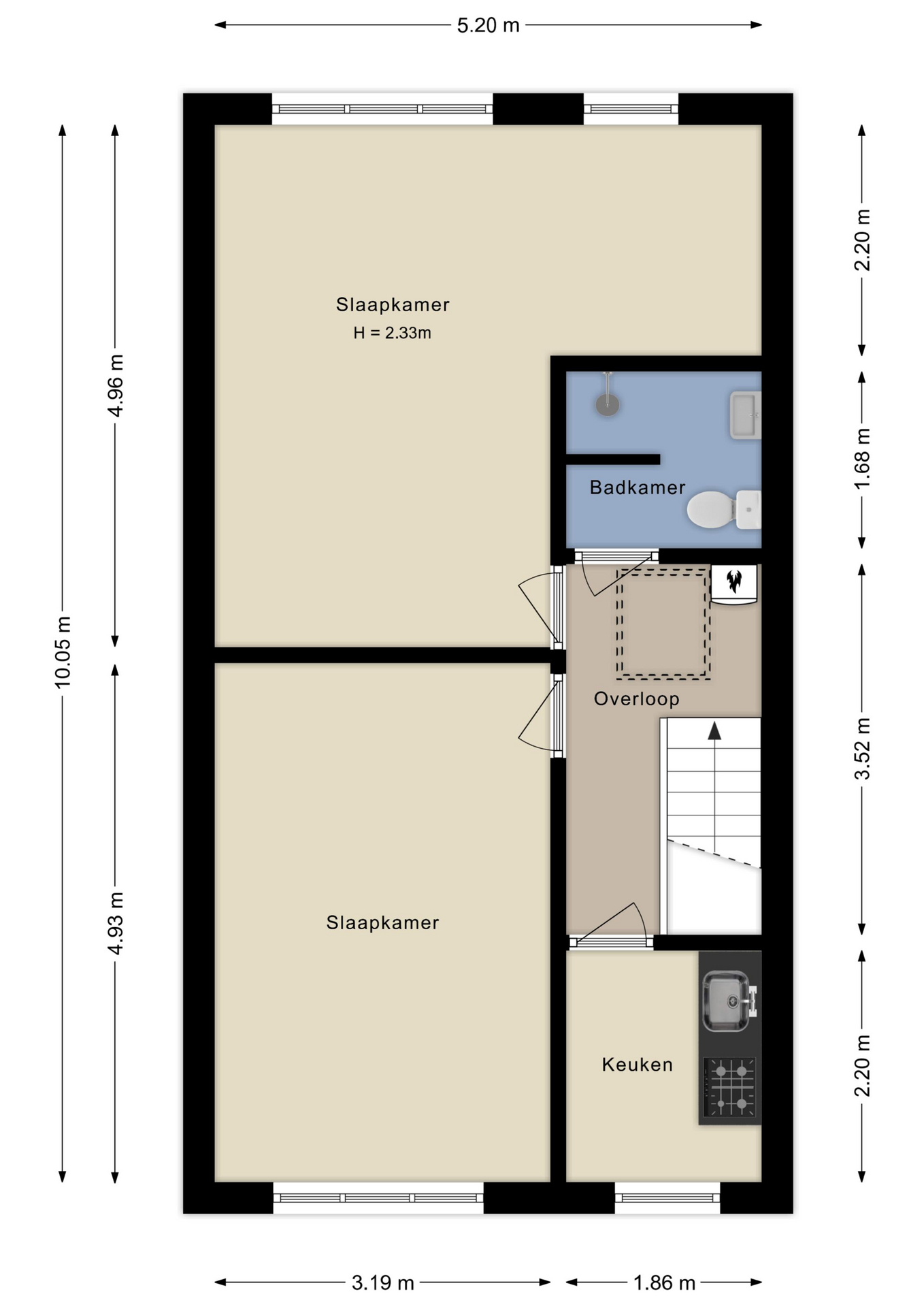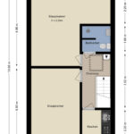 Tweede verdieping: overloop, twee – eventueel drie – slaapkamers, een tweede badkamer met douche en toilet, en een tweede keuken.