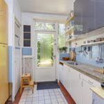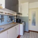 De keuken is voorzien van een originele Piet Zwart keuken met originele kleurstelling, in roomwit, grijs en een houtlook finish. Het lange deel van de keuken is voorzien van een aanrecht met daaronder kastruimte. Er zijn drie kasten boven het aanrecht en verder zijn er planken om spullen die je dagelijks gebruikt praktisch en binnen handbereik te kunnen plaatsen. In het lange deel van de keuken zit de wasbak met een kraan en aan het einde staat de oven met kookplaat en afzuiginstallatie. Tegen de andere wand is ook nog kastruimte. Hier is een magnetron en vooral veel opbergruimte. Het is mogelijk om de muur tussen de woonkamer en keuken open te breken en zo een open keuken te creëren.