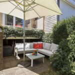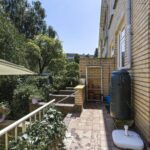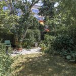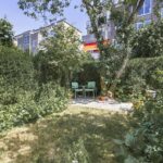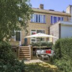 De achtertuin begint zodra je de eetkamer of keuken uitstapt. Hier heb je een bordes met een regenton die water opvangt en is een heerlijke plek om van de ochtendzon te genieten met een ontbijtje. Met een kleine trap ga je vervolgens naar beneden en loop je je tuin in met diverse terrassen, gazon en veel plek om lekker buiten te zitten. Het is een heerlijk groene achtertuin met veel klimplanten, struiken, bomen en bloemen. De diverse zitplekjes in de tuin nodigen op elk moment van de dag uit om even een frisse neus te halen en te ontspannen. In de zomer kun je er zelfs een zwembad voor de kinderen neerzetten en vanaf het bordes op een handige manier toezicht houden.