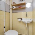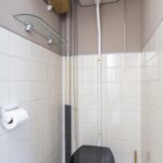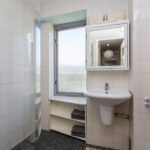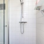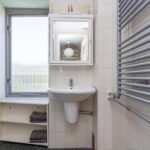 De badkamer is voorzien van een inloopdouche met glazen wand, een wastafel en een handdoekenradiator. Onder het raam staat een compact meubel voor handdoeken of andere attributen.