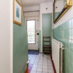 Via een trapje kom je bij de voordeur. De hal is volledig betegeld in een authentieke kleurstelling. Wit, rood en een zacht groen wisselen elkaar hier af. In de hal is ook het toilet met fonteintje.