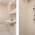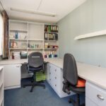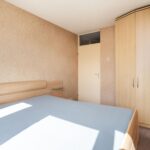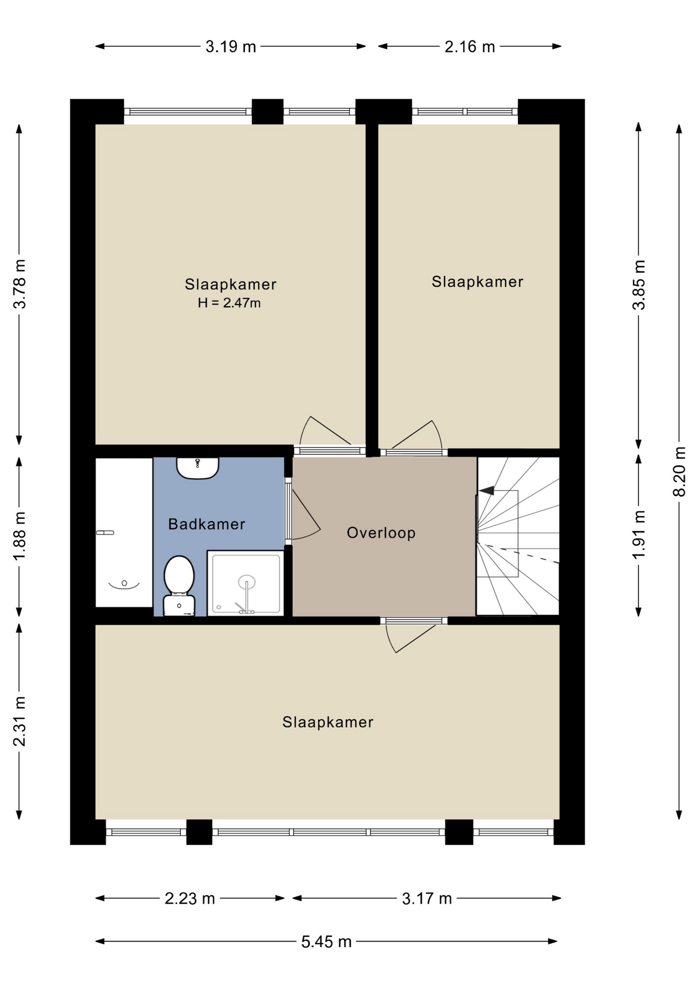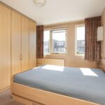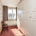 Aan de achterzijde van de woning bevinden zich twee slaapkamers, terwijl aan de voorzijde een ruime werkkamer is gelegen. Tussen deze ruimtes in vind je een eenvoudige, inpandige badkamer. De vloer is bedekt met tapijt en de muren zijn afgewerkt met behang, wat een warme en gezellige sfeer creëert.