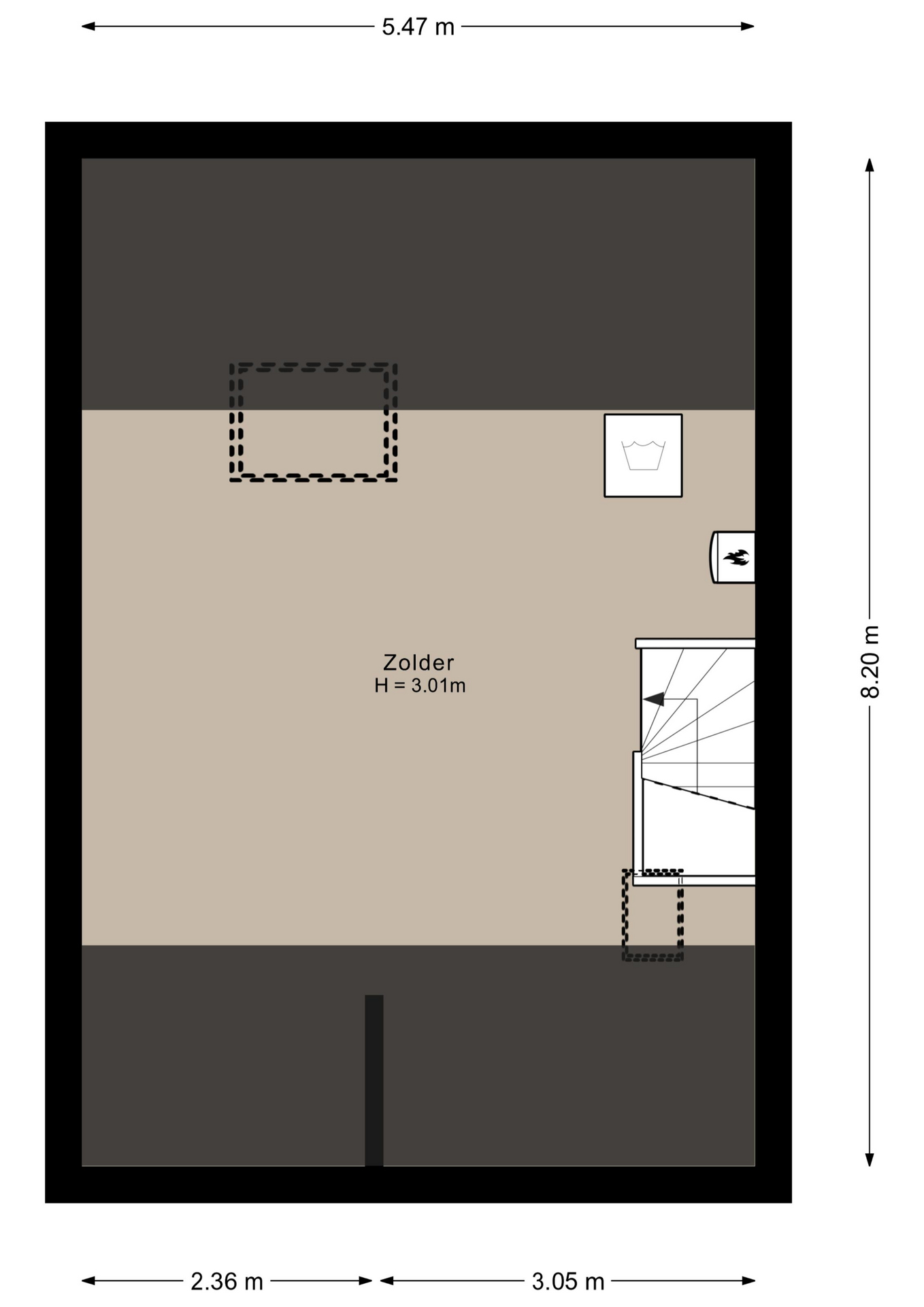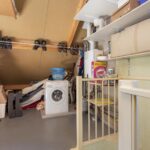 De open zolder herbergt de technische ruimte, waarin de aansluiting voor de wasmachine en droger is geplaatst, samen met de cv-ketel. Deze praktische indeling zorgt voor efficiënt gebruik van de beschikbare ruimte en biedt gemakkelijke toegang tot de noodzakelijke installaties.