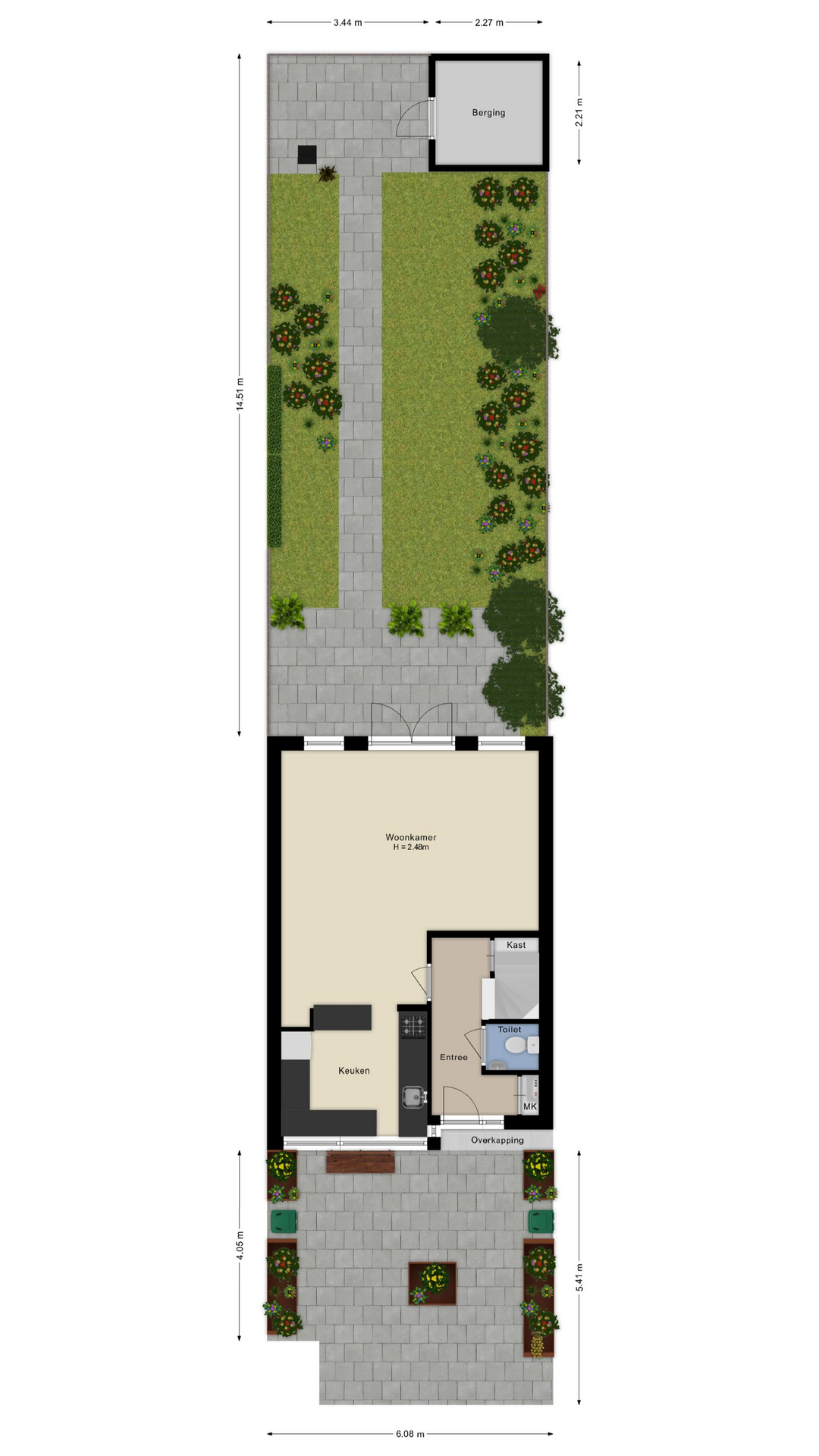 De keuken is aan de voorzijde gesitueerd en is basic qua afwerking. Aan de achterzijde is de lichte maar ruime woonkamer, hier is het nog mogelijk om een stuk uit te bouwen.
