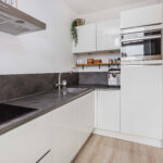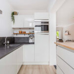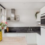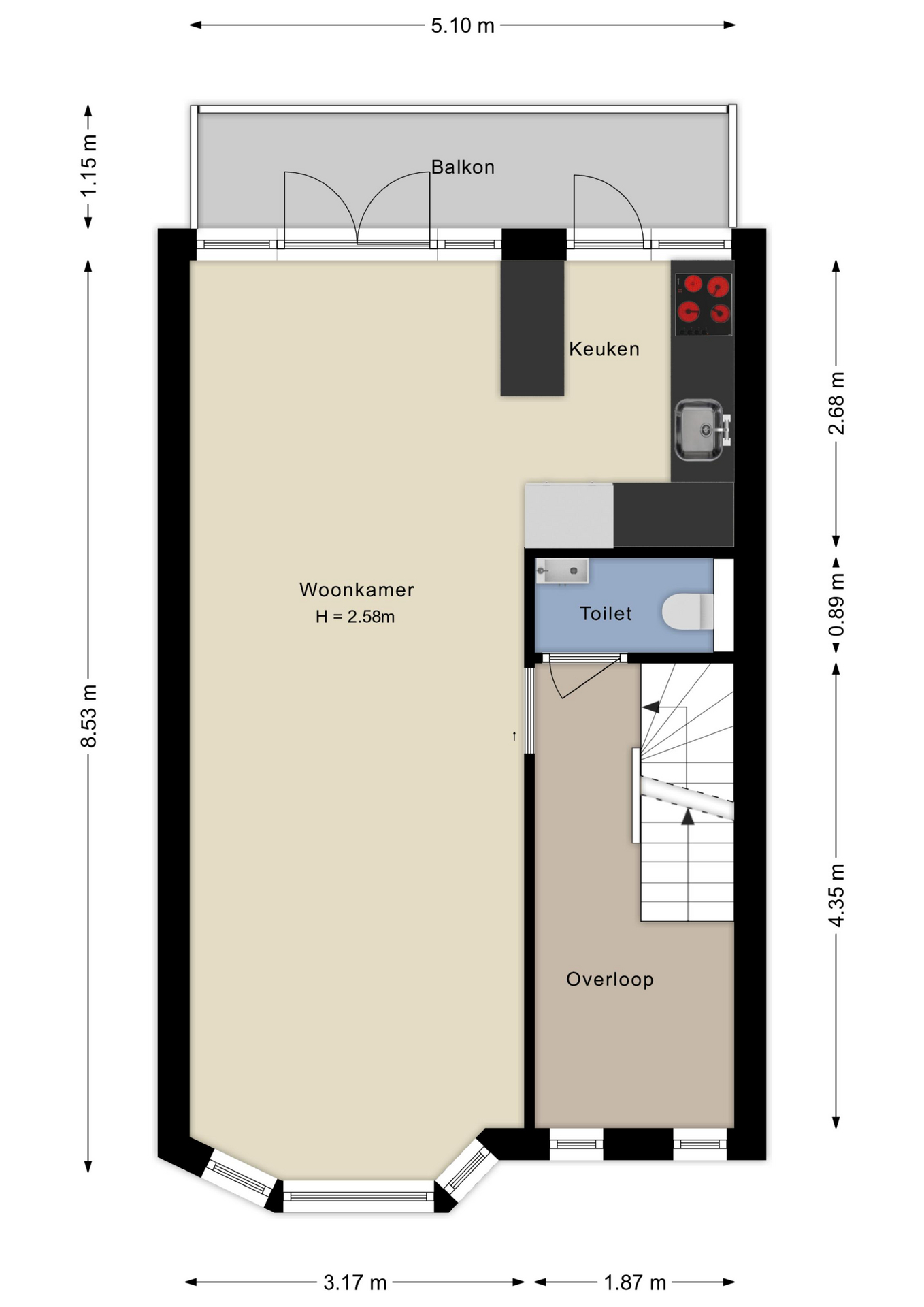 Overloop met toegang tot het separate toilet. Aan de voorzijde bevindt zich de lichte woonkamer met erker, die zorgt voor een aangename lichtinval en een ruimtelijk gevoel. Aan de achterzijde ligt de open keuken, voorzien van diverse inbouwapparatuur en met directe toegang tot het balkon – een fijne plek om buiten te zitten.