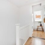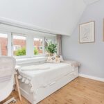 Overloop met toegang tot drie slaapkamers. De royale ouderslaapkamer beschikt over een en suite badkamer, wat zorgt voor extra comfort en privacy. De badkamer is compact maar compleet ingericht met douche en wastafel. De overige twee slaapkamers zijn ideaal te gebruiken als kinder-, werk- of logeerkamer. Daarnaast is er een aparte wasruimte en extra bergruimte aanwezig.