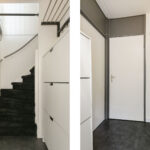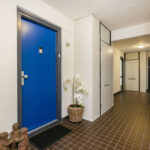 Via de entree met het bellentableau en de brievenbussen bereik je de trapopgang en de aparte berging, die extra bergruimte biedt.