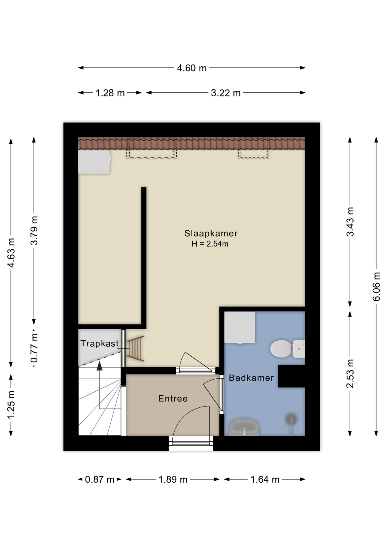 Bij binnenkomst betreed je de hal. De entree/hal leidt je naar de trap die toegang geeft tot de riante woonkamer op een hogere verdieping, maar ook naar de ruime slaapkamer met een inloopkast en een nette, neutraal afgewerkte badkamer. Deze badkamer is uitgerust met douche, toilet en wastafel.
