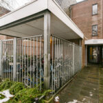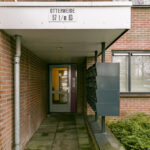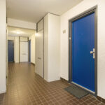 Via de entree met het bellentableau en de brievenbussen bereik je de trapopgang en de aparte berging, die extra bergruimte biedt.