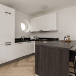 Sfeervolle en lichte woonkamer met diverse, leuke raampartijen en een moderne, open, hoekopgestelde keuken v.v. gaskookplaat, afzuigkap, oven, koelkast, vriezer en vaatwasser.