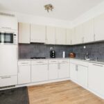 De keuken is in een L-opstelling gepositioneerd en is voorzien van diverse inbouwapparatuur.