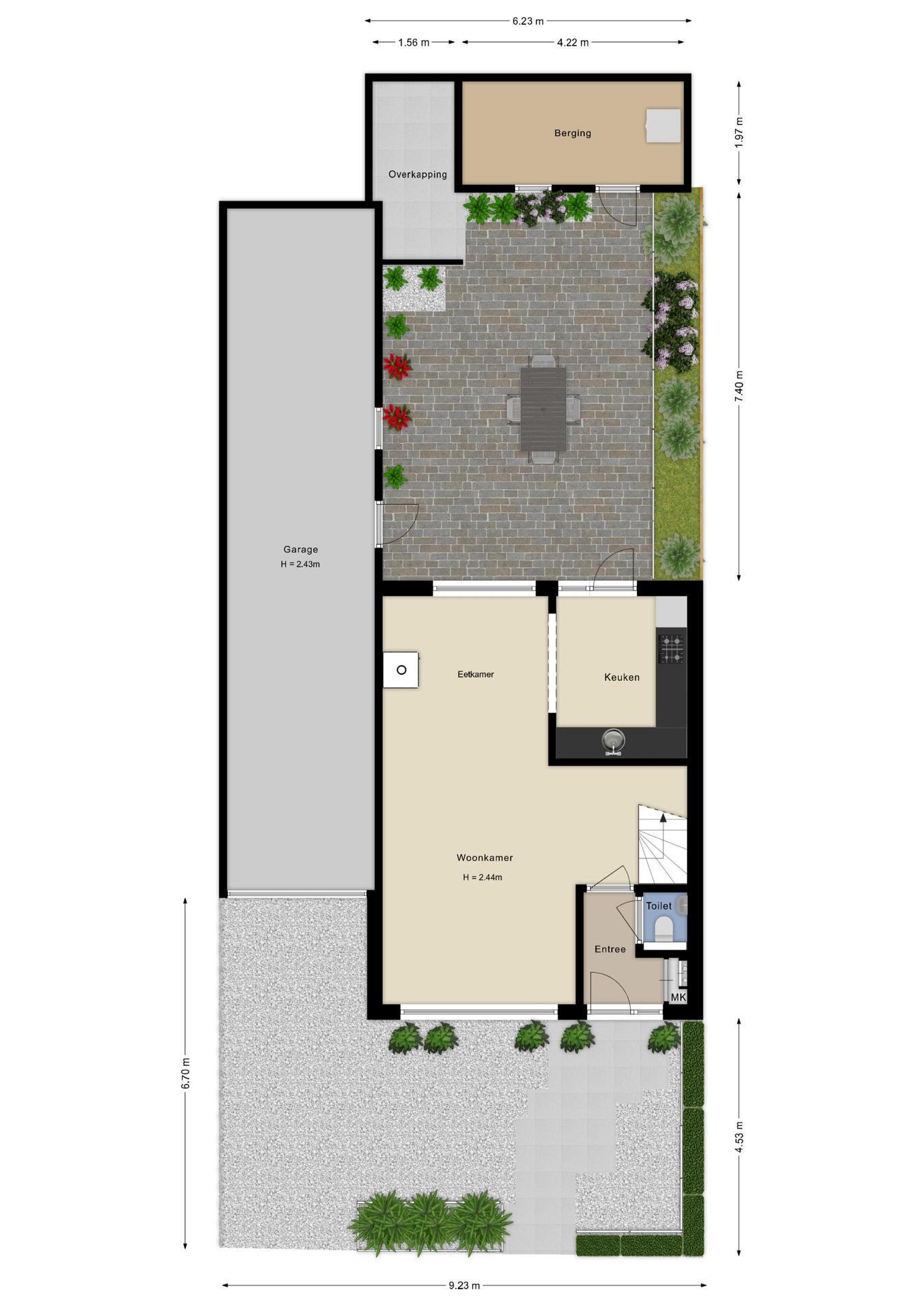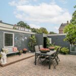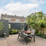 De woning beschikt over een brede voor- zij- en achtertuin, waar je een hele dag kunt genieten van de zon of de schaduw. De tuin is onderhoudsvriendelijk ingericht met een ruim terras. Verder is er een handige en ruime garage van 13 meter lang aanwezig voor fietsen, tuingereedschap of zelfs een auto (of 3). De achtertuin, gelegen op het oosten biedt veel mogelijkheden. In de tuin is ook een stenen berging aanwezig, hier staat op dit moment de wasmachine.