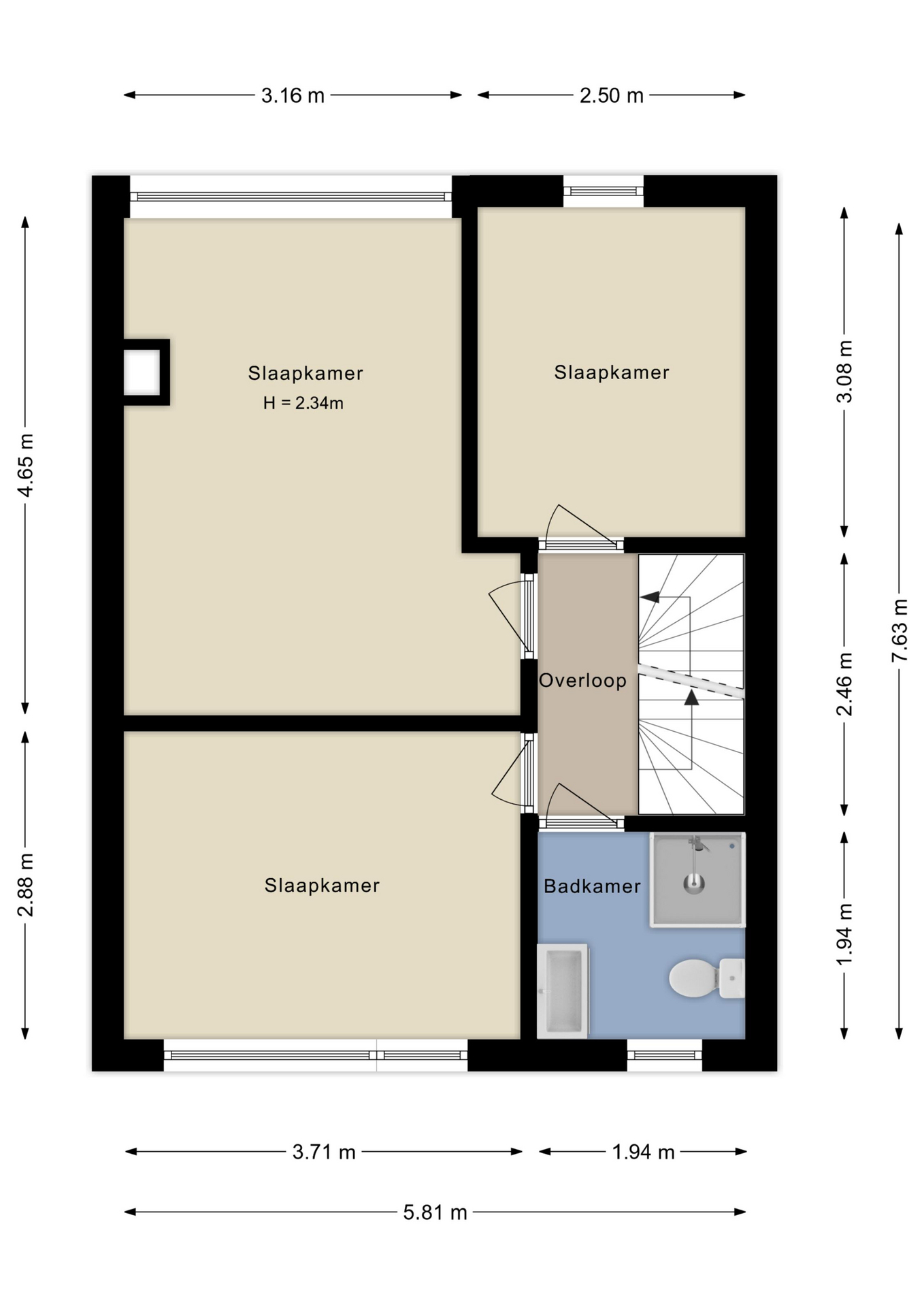 Op de eerste verdieping zijn drie slaapkamers en een badkamer gesitueerd. Aan de voorzijde is één slaapkamer gesitueerd en aan de achterzijde nog twee slaapkamers, waaronder de grote 'masterbedroom'. De badkamer (aan de voorzijde van de woning) is compact maar praktisch: voorzien van een douche, een wastafelmeubel en een tweede toilet.