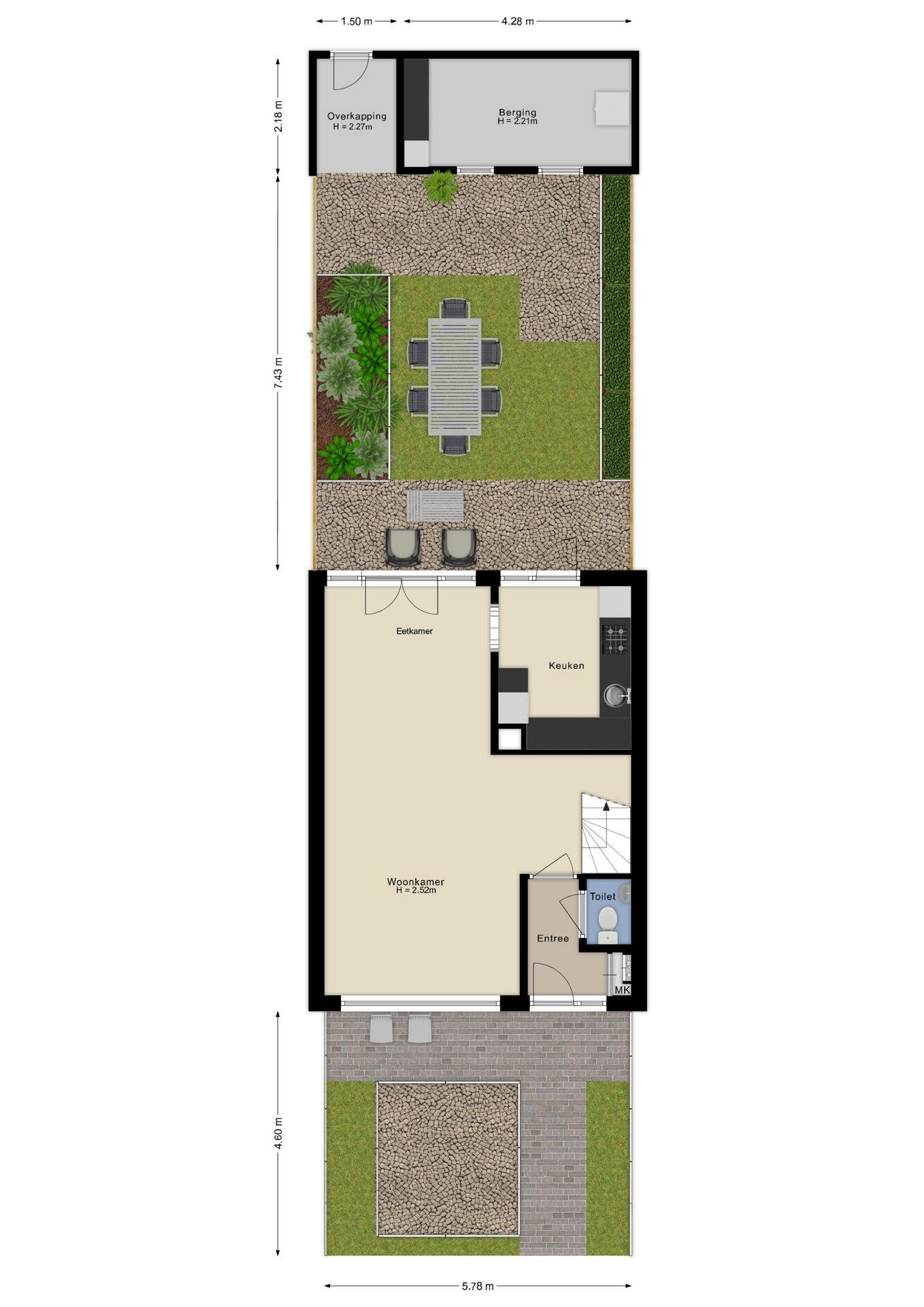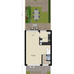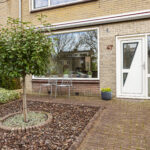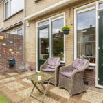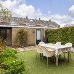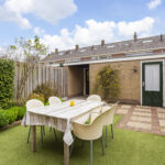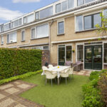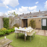 De verzorgde achtertuin ligt op het oosten, waardoor je al vanaf de ochtend heerlijk van de zon kunt genieten. De tuin is ingericht met een royaal terras, kunstgras en borders met vaste beplanting. Achterin de tuin bevinden zich een stenen berging met elektra en een handige overkapping. Via de achterom is de tuin ook van buitenaf bereikbaar – ideaal voor fietsen of het afvoeren van tuinafval.