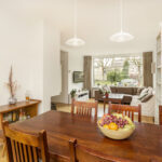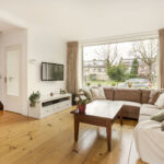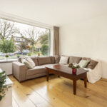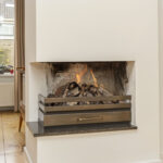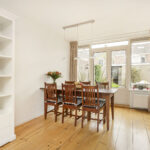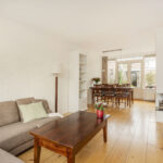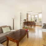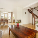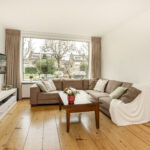 De woonkamer is verrassend ruim en licht door de brede raampartij aan de voorzijde en o.a. de openslaande deuren naar de achtertuin. De houten vloer, de gas open haard en het vrije zicht op de tuin zorgen voor een warme en sfeervolle leefruimte. De trapopgang naar de eerste verdieping bevindt zich praktisch aan de zijkant van de woonkamer.